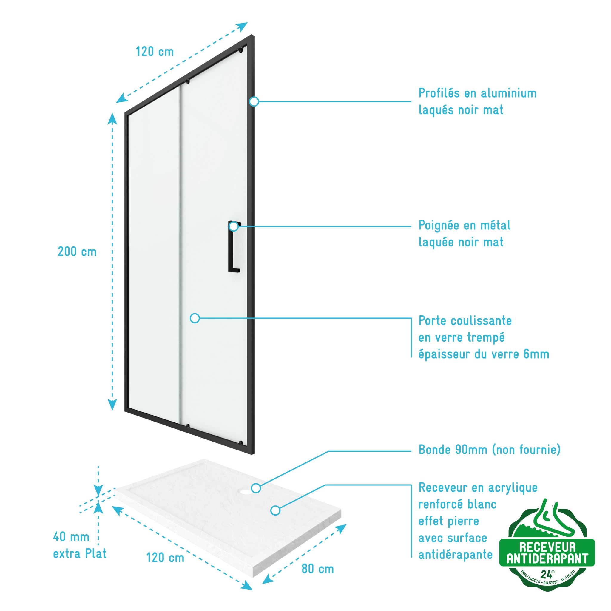 PACK PAROI PORTE DE DOUCHE + RECEVEUR A POSER – 120×80 COULISSANTE -CRUSH MOON 120×80
