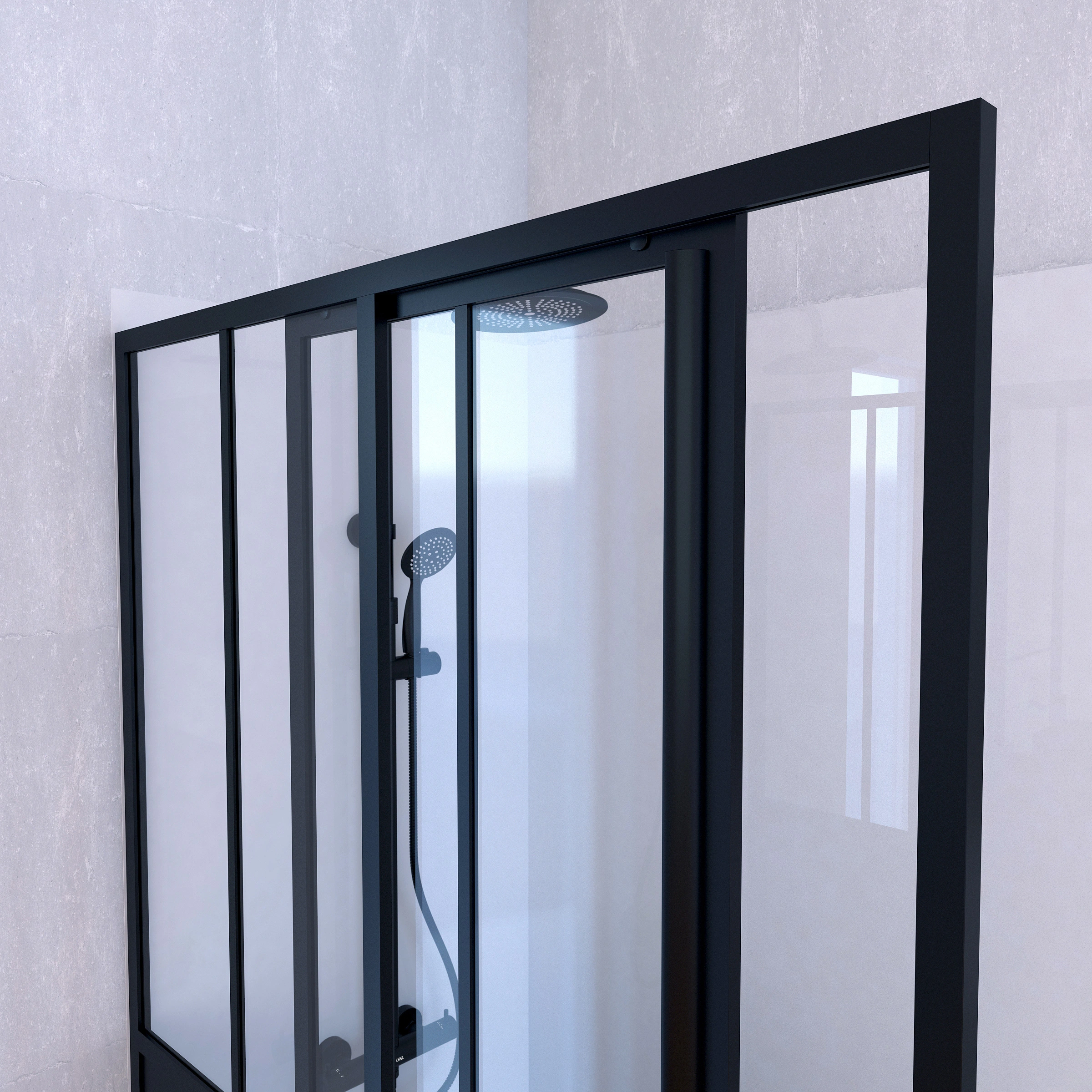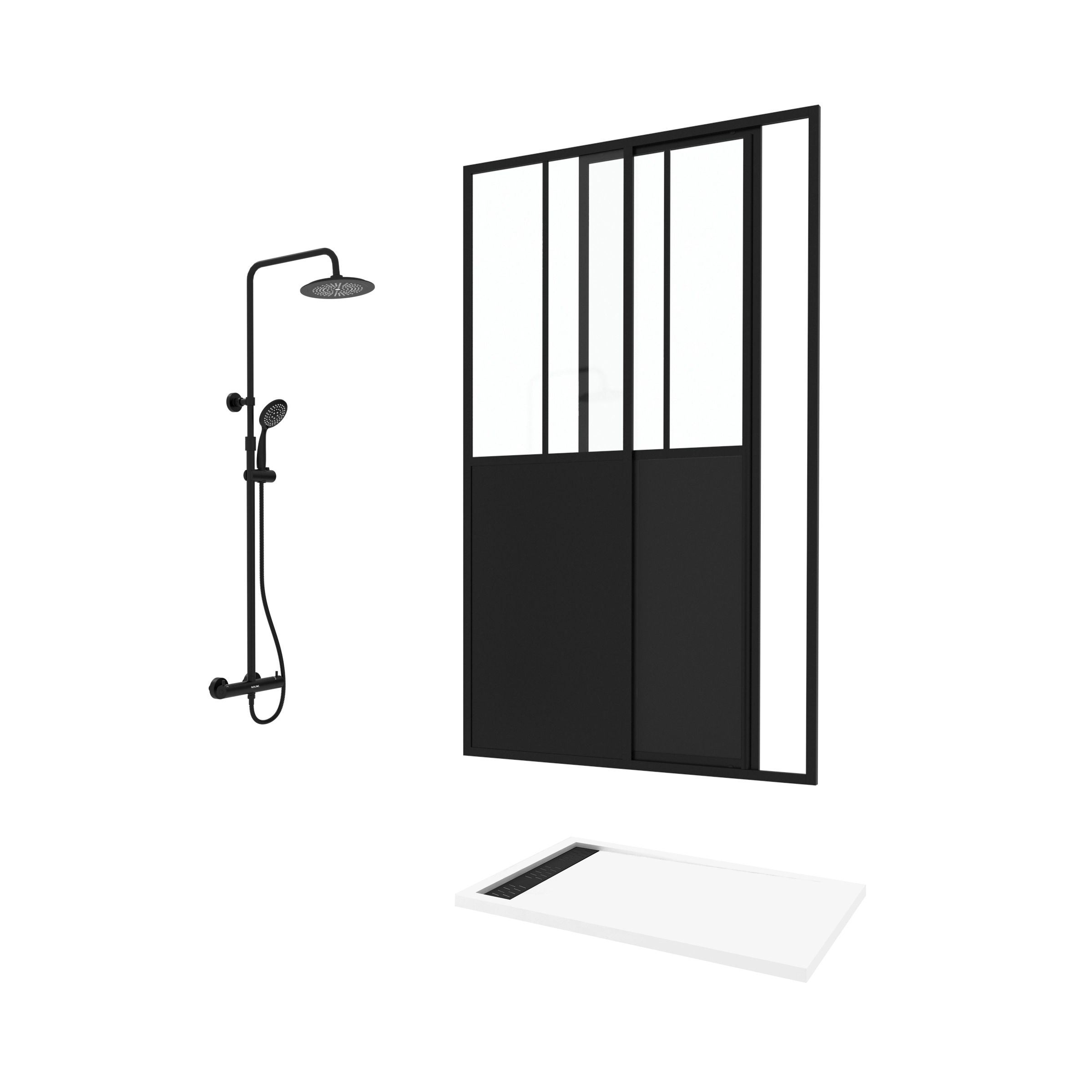 Ensemble comprenant une porte coulissante ‘Type Atelier’, ainsi qu’un receveur en acrylique Blanc à grille linéaire et une colonne de douche Thermostatique