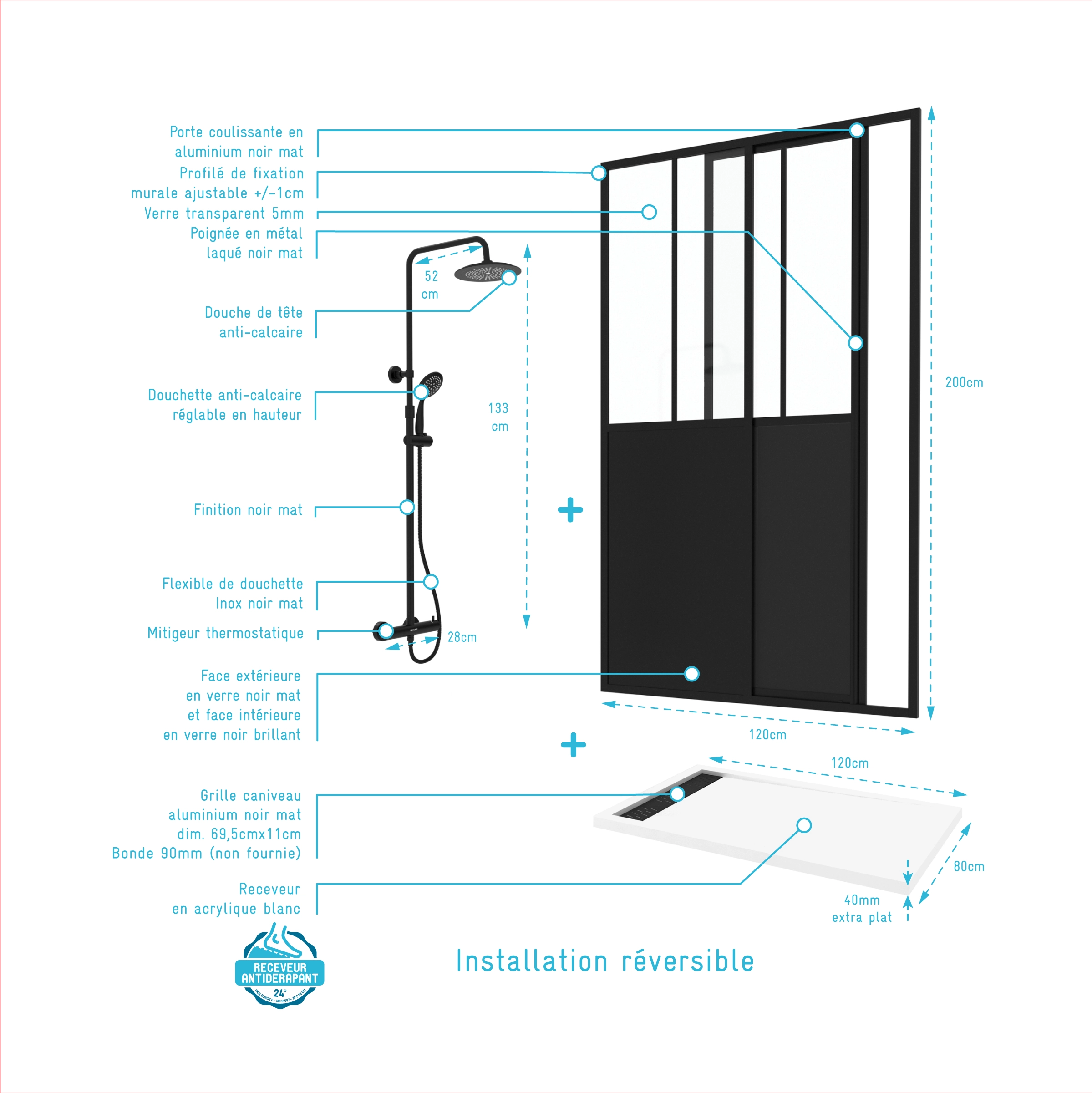 Pack Porte Coulissante Noir Mat + Receveur Blanc 120x80x204 cm et Colonne de Douche Thermostatique