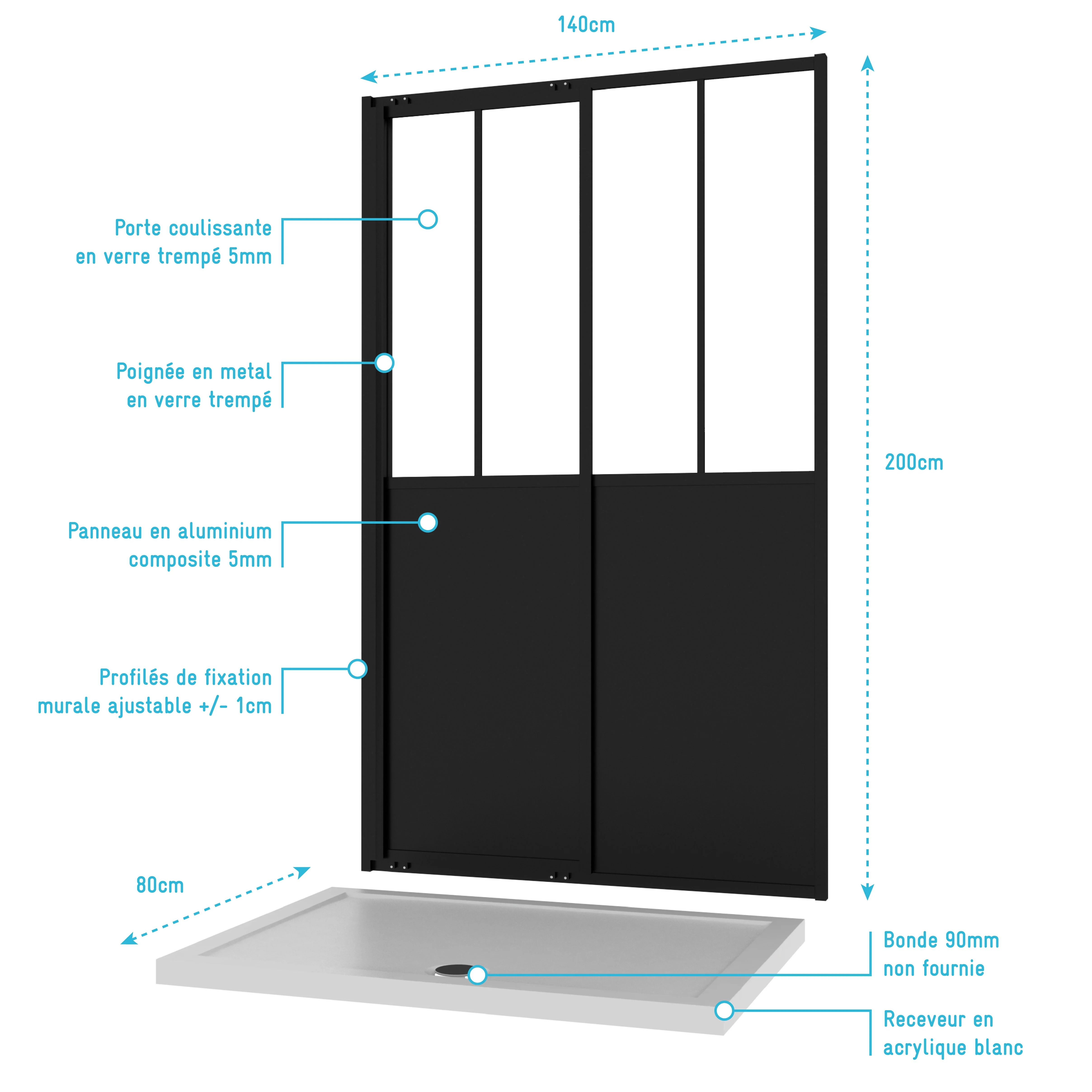 3 avis pour Pack Porte Coulissante Noire Mate Type ‘Atelier’ et Receveur en Acrylique Blanc – 140x80x200 cm