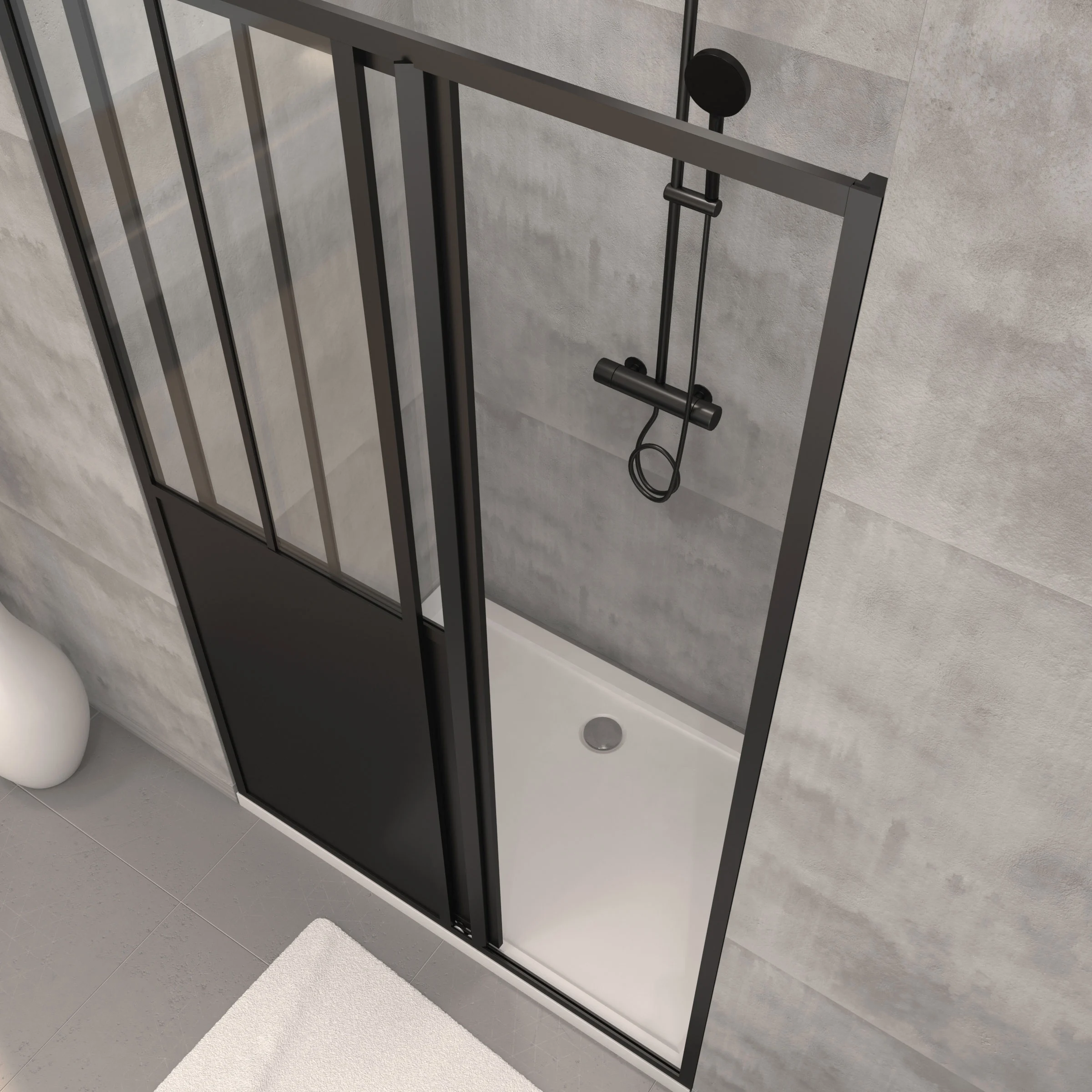 3 avis pour Pack Porte Coulissante Noire Mate Type ‘Atelier’ et Receveur en Acrylique Blanc – 140x90x200 cm