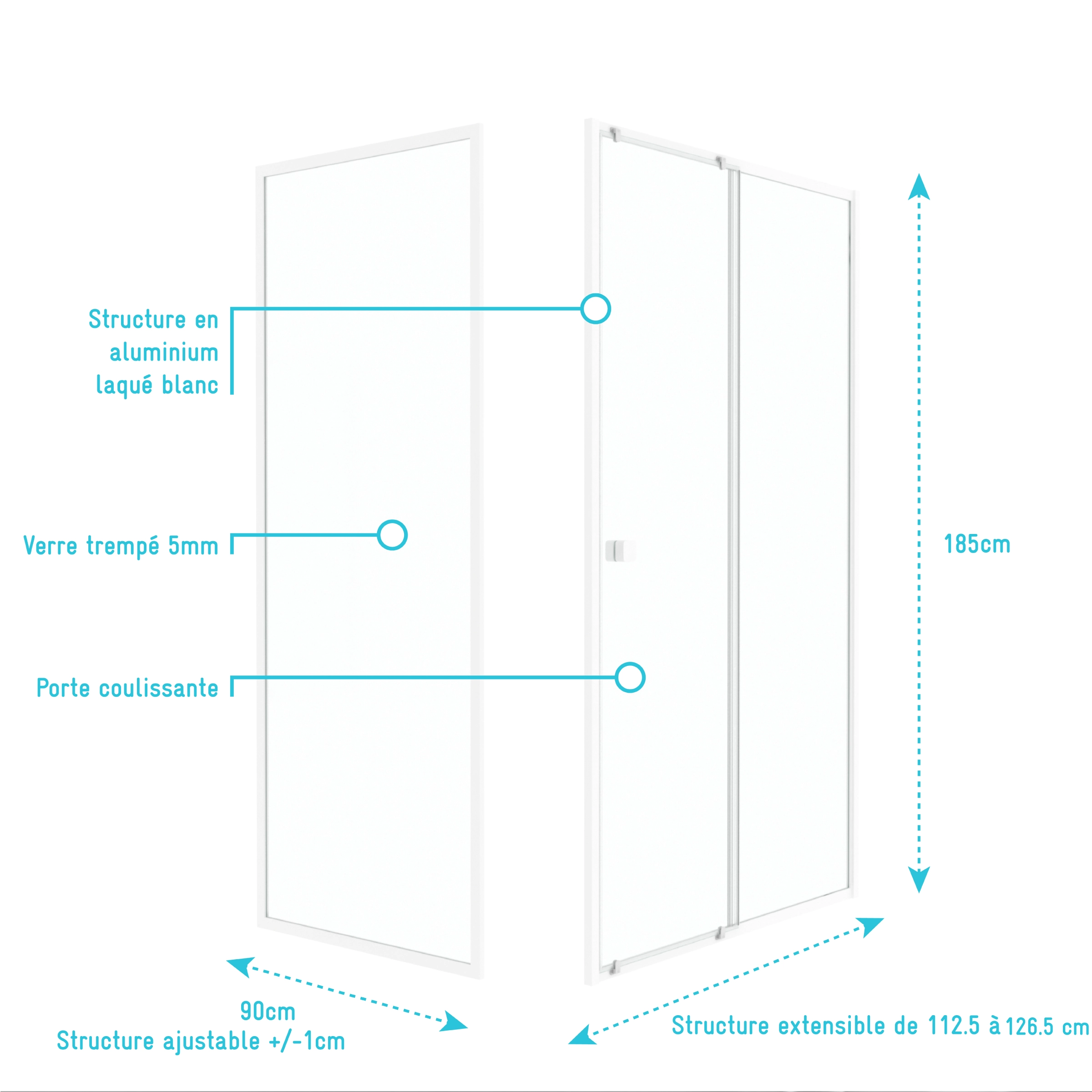 Pack porte de douche Coulissante blanc 120x185cm + retour 90 verre transparent 5mm – WHITY slide 120