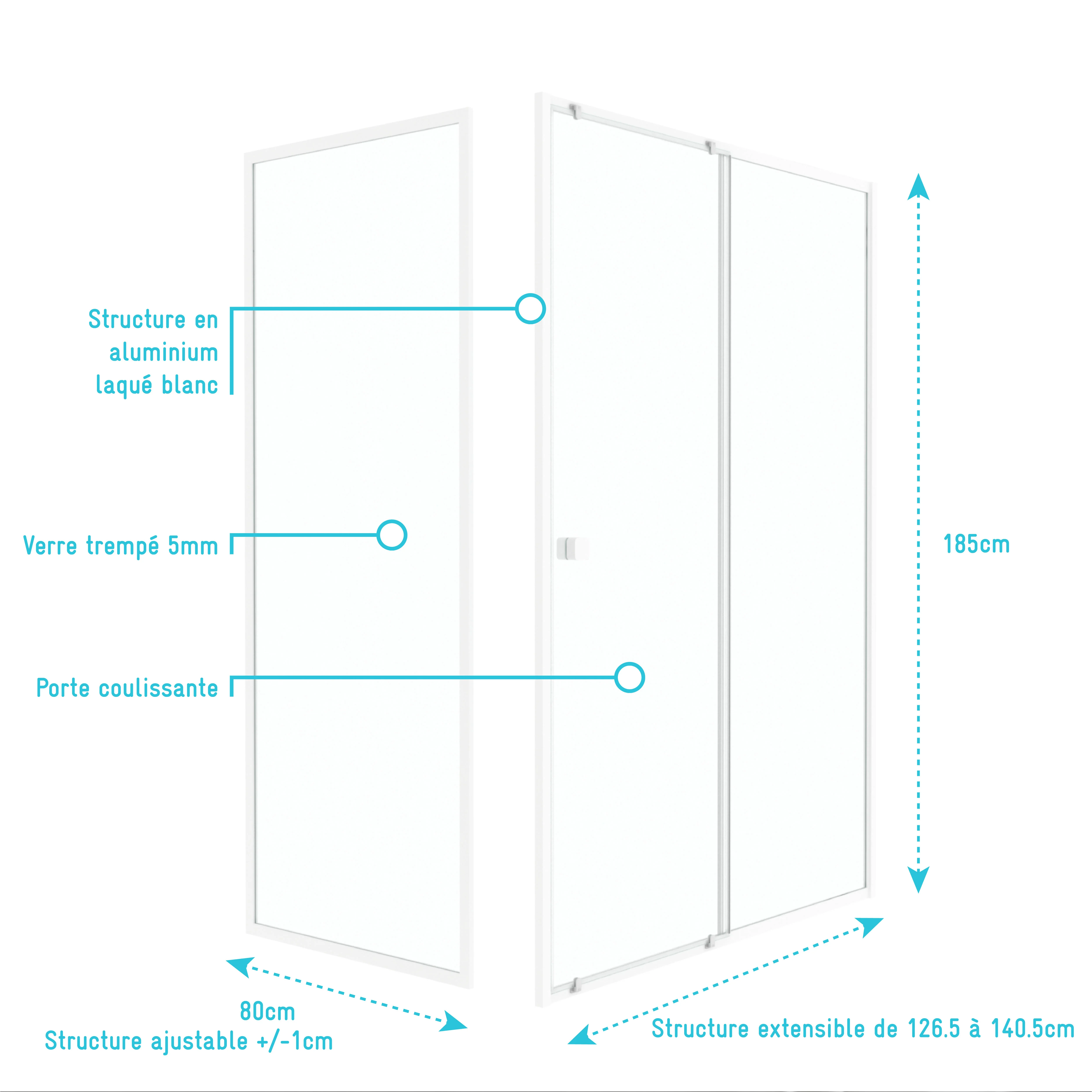 Pack porte de douche Coulissante blanc 140x185cm + retour 80 verre transparent 5mm – WHITY slide