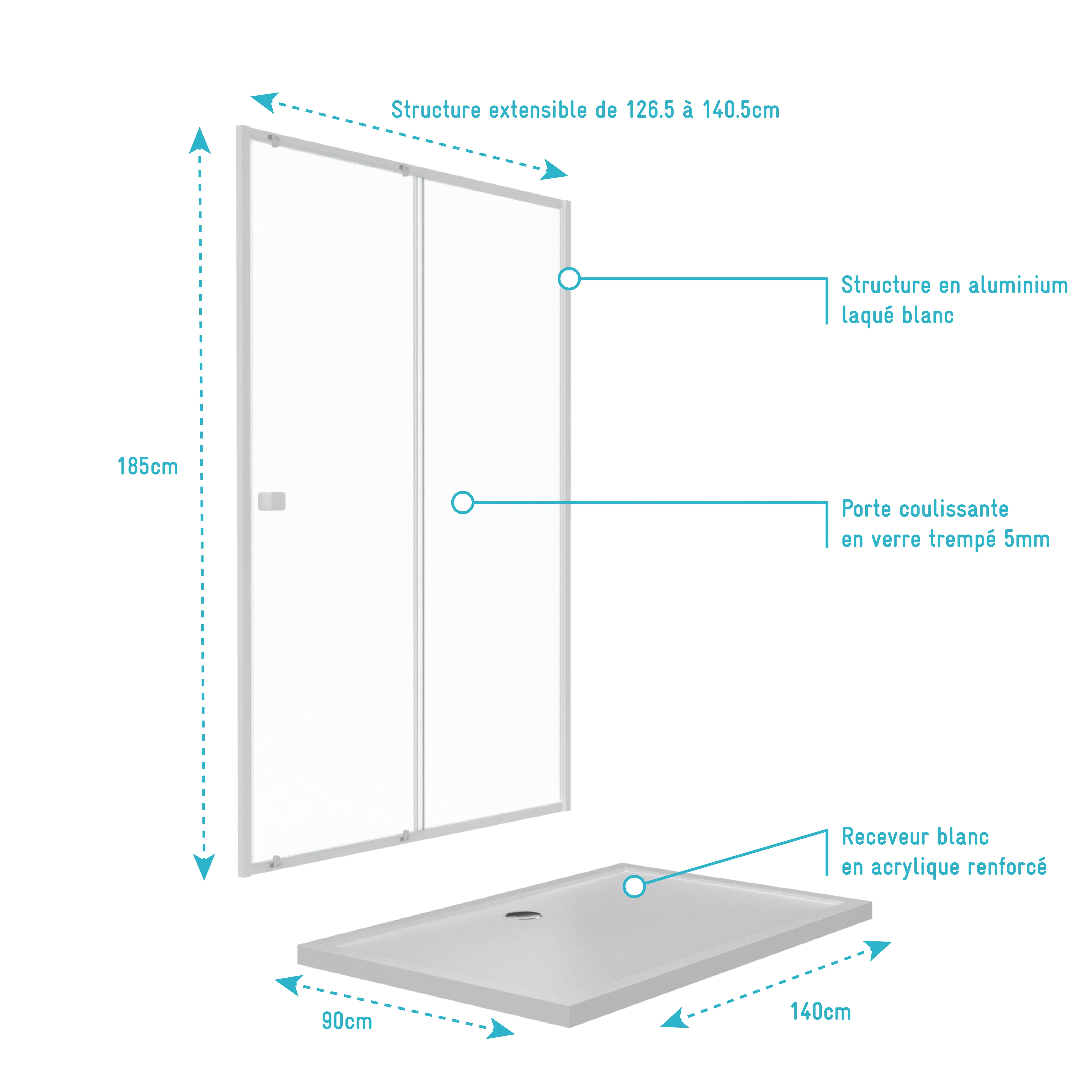 Pack porte de douche coulissante blanc 140x190cm + receveur 90×140 – WHITY SLIDE