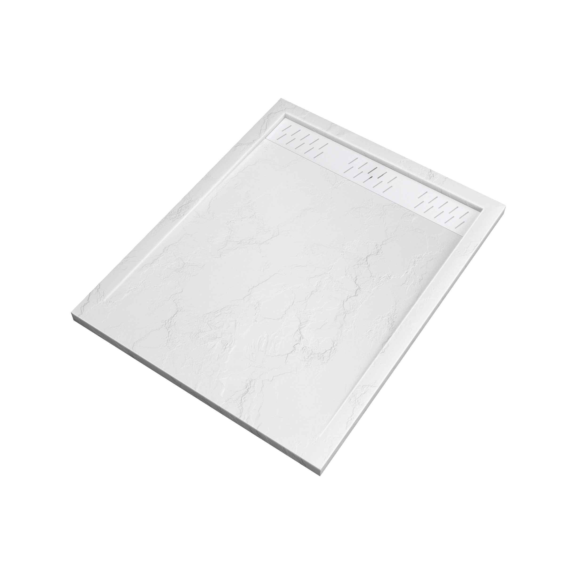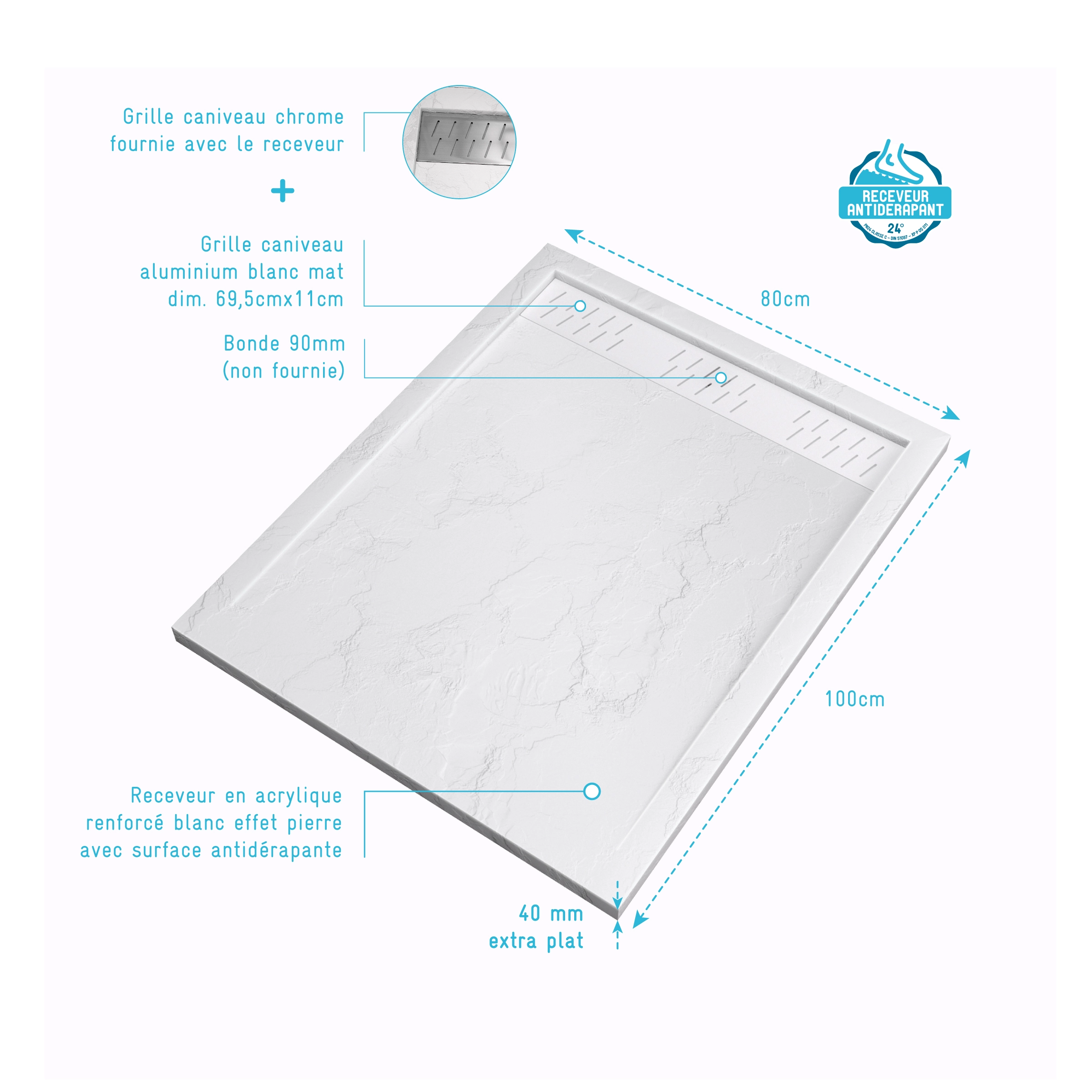 Receveur en acrylique Blanc Effet Pierre 80x100x4 cm + Grilles Linéaires Chrome et Blanche Mate