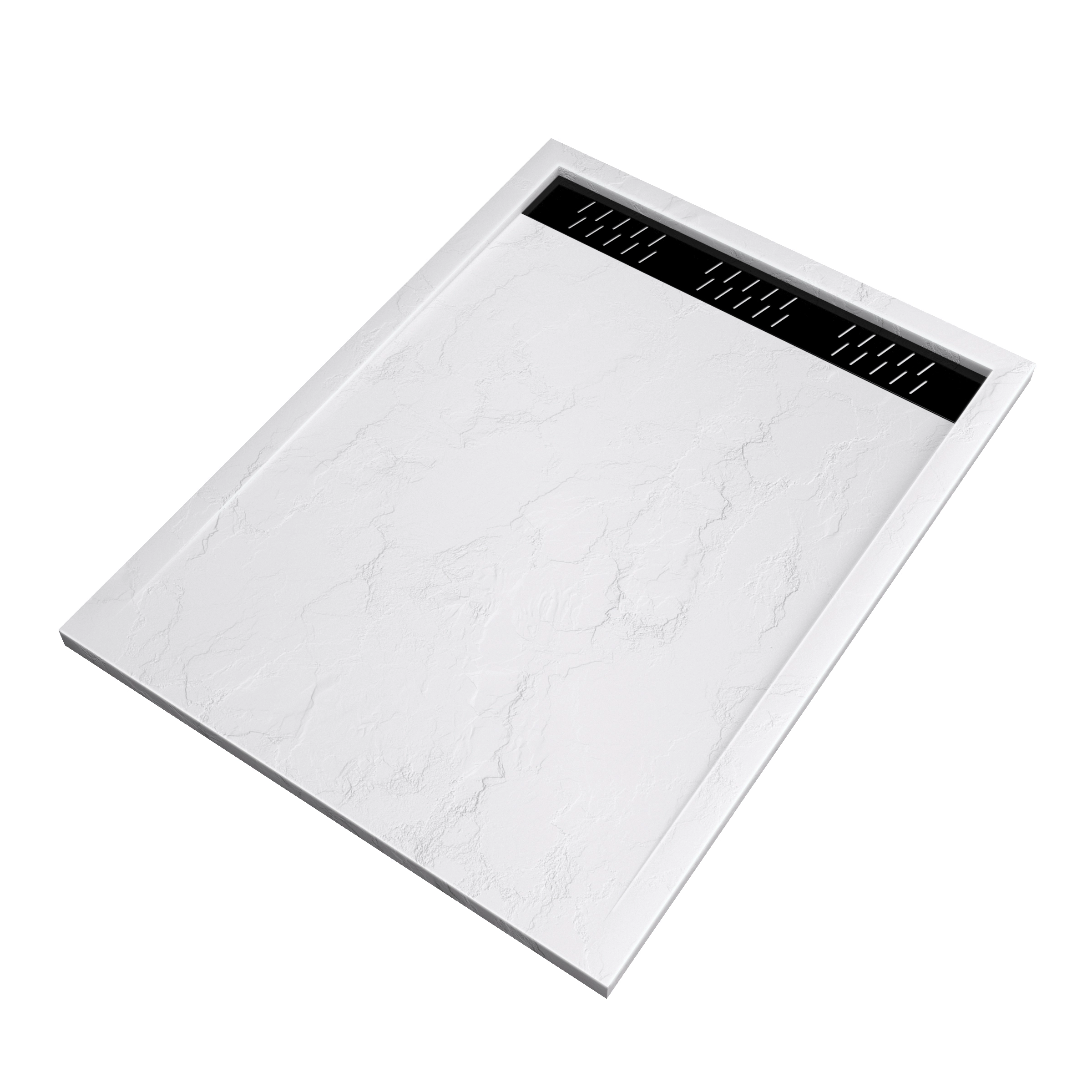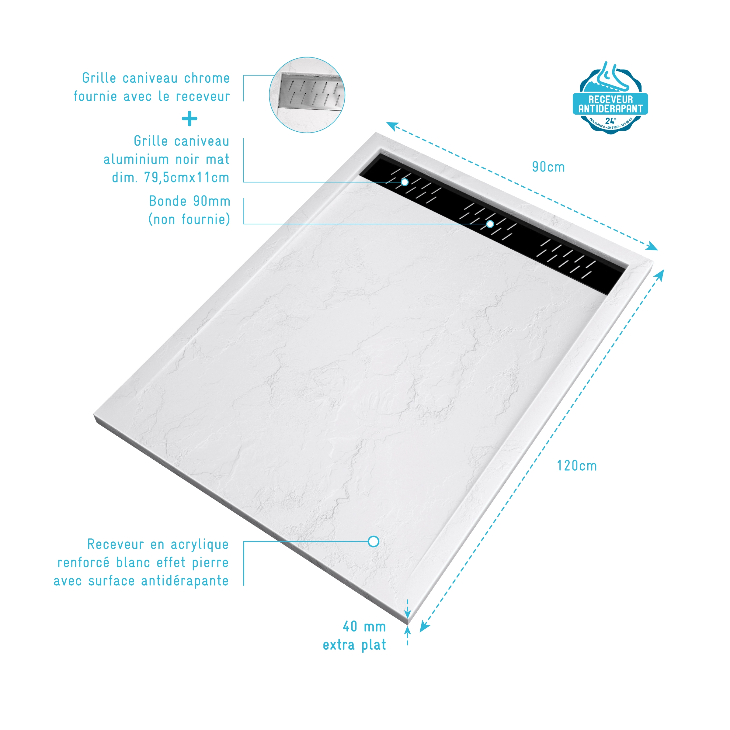 Receveur en acrylique Blanc Effet Pierre 90x120x4 cm + Grilles Linéaires Chrome et Noire – MOON