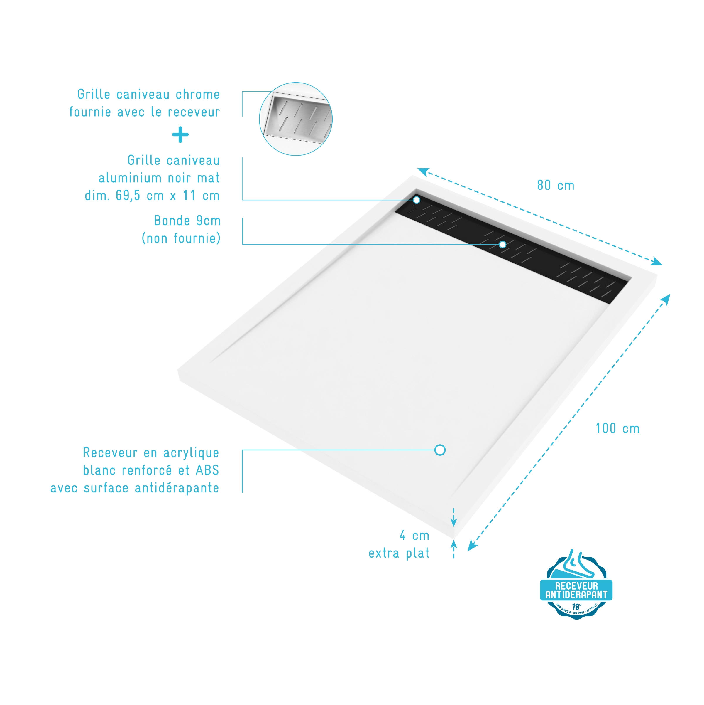 Receveur en acrylique Blanc 80x100x4 cm + Grilles Linéaires Chrome et Noire – WHITENESS II