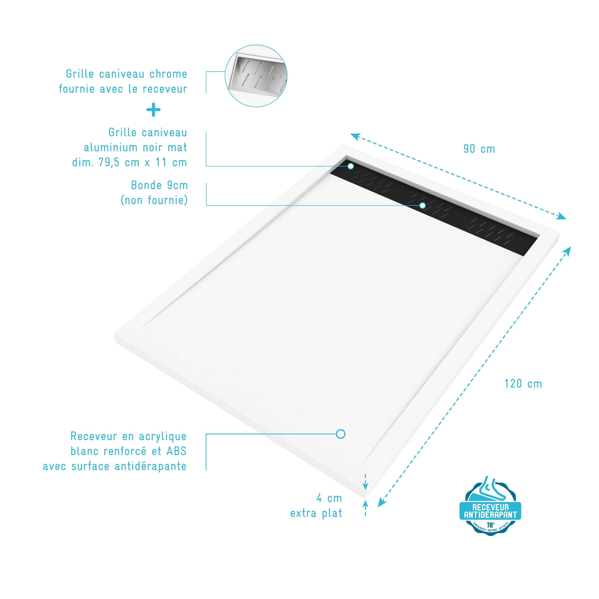 Receveur en acrylique Blanc 90x120x4 cm + Grilles Linéaires Chrome et Noire – WHITENESS II