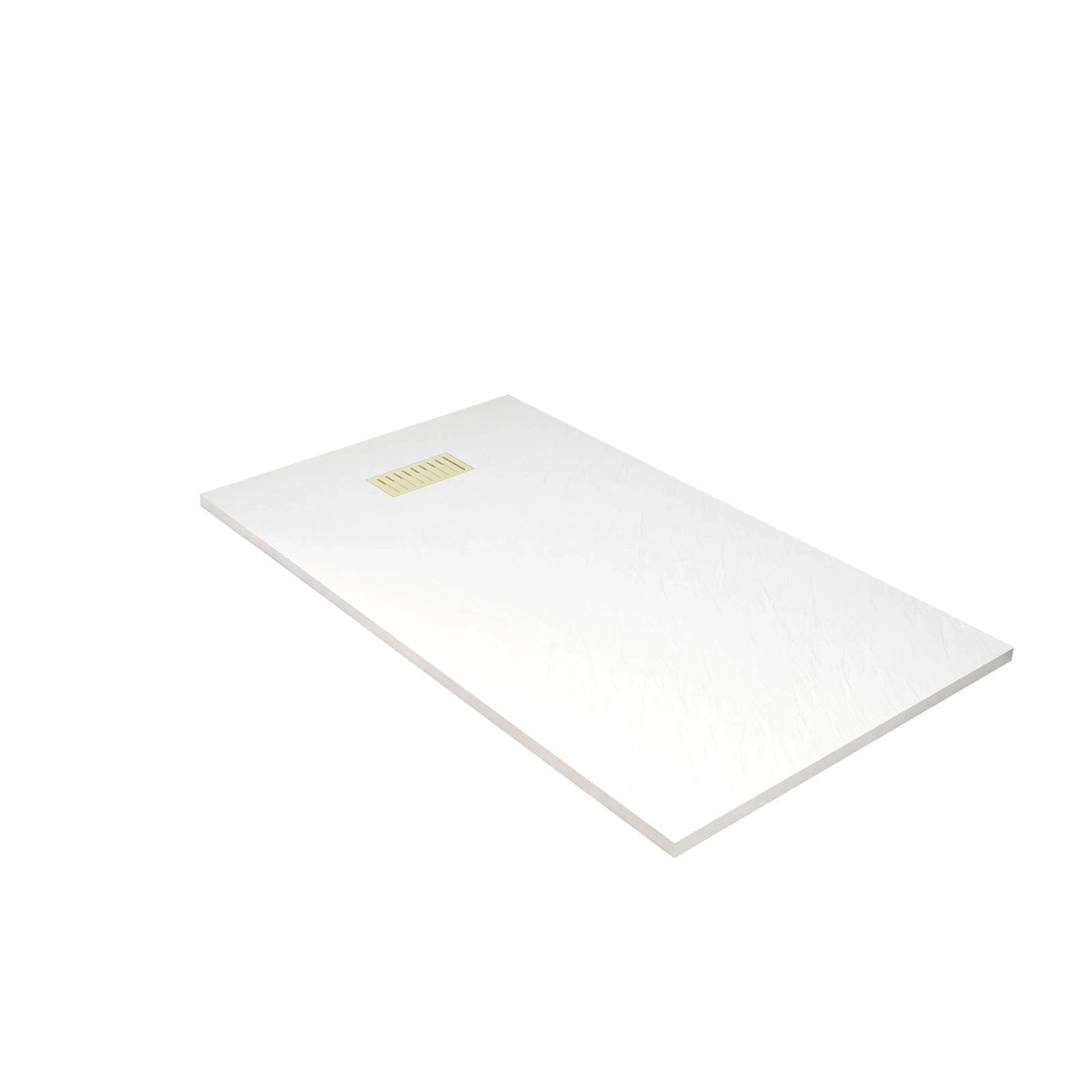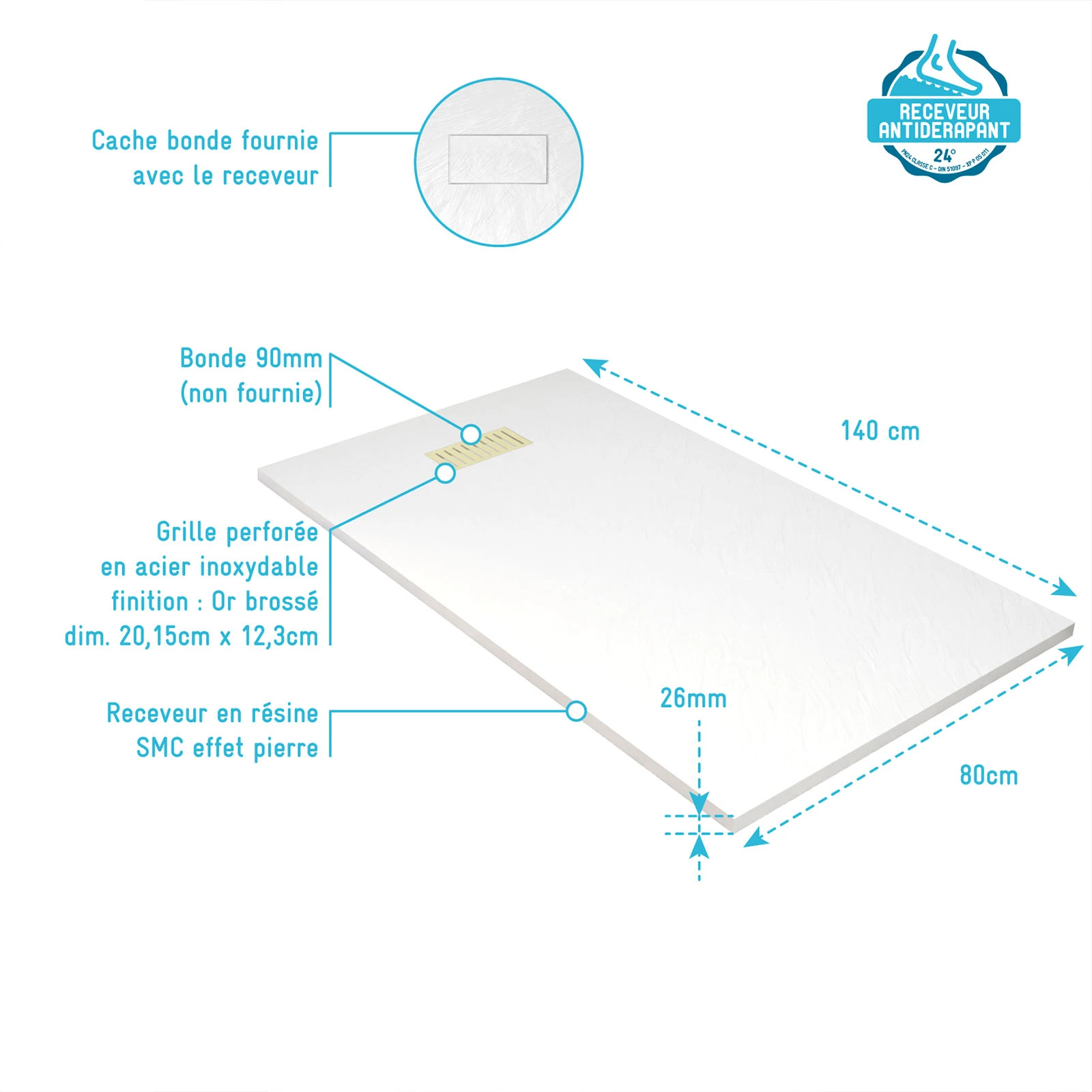 Receveur de douche Blanc Effet Pierre 80x140 cm et Grille décor Linéaire Or Doré Brossé