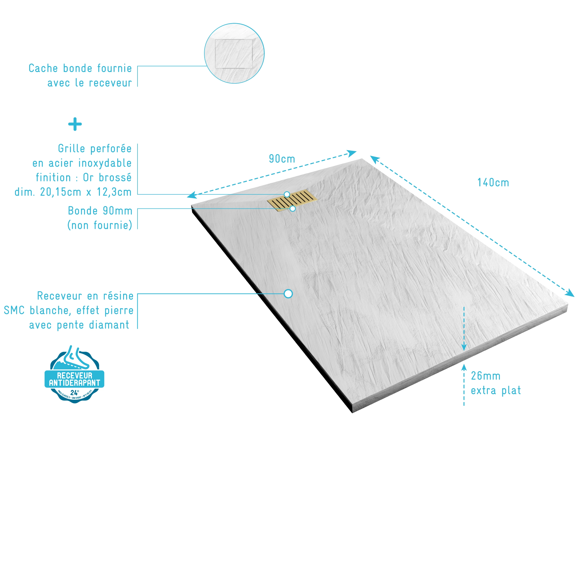 0 avis ATHENA Receveur de douche en résine blanc 90x120x3 cm effet pierre granit + grille linéaire or brossé