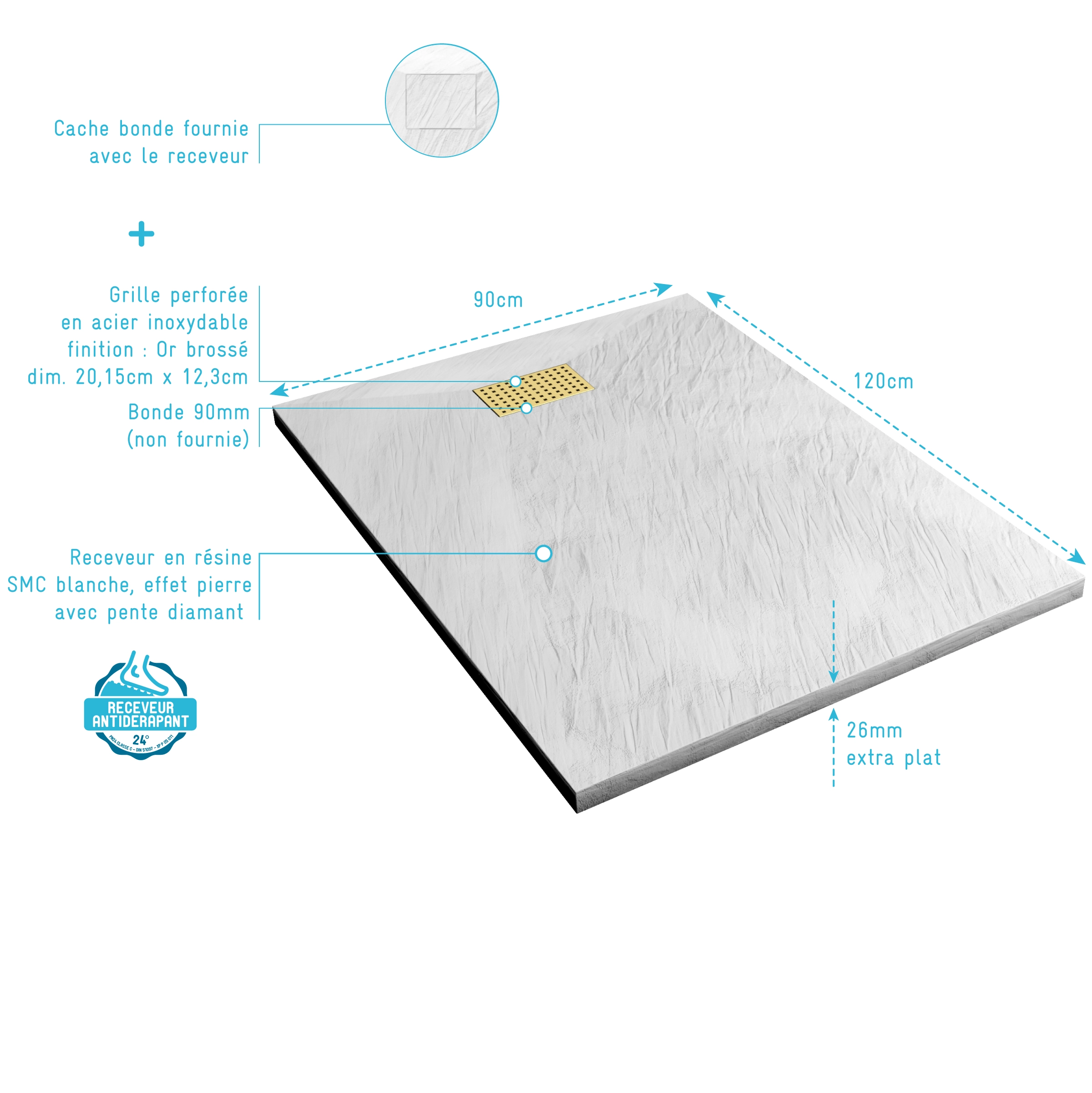 Receveur de douche Blanc Effet Pierre 90×120 cm et Grille décor Perforée Or Doré Brossé