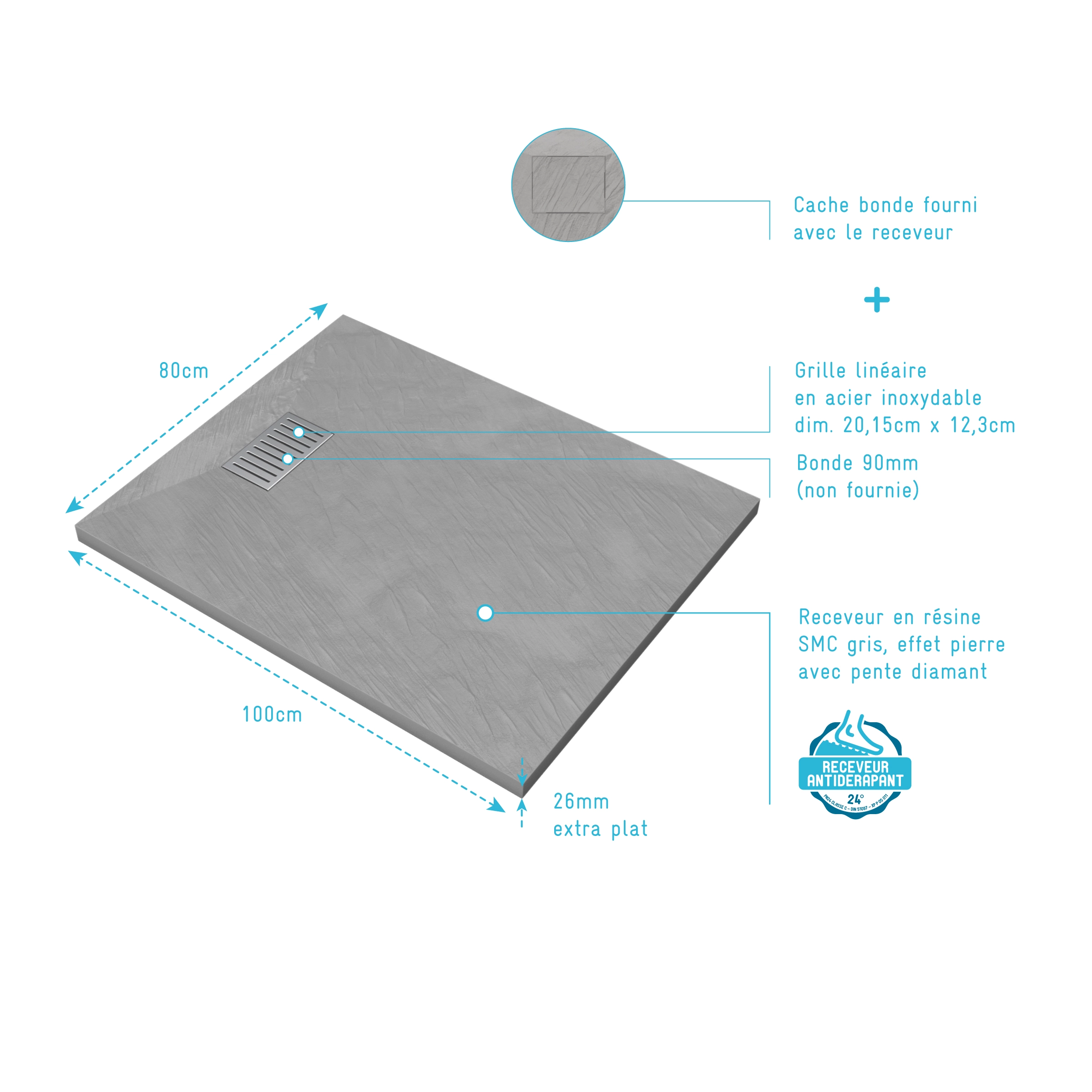 Receveur de douche Gris Effet Pierre 80×100 cm et Grille décor Linéaire en Inox
