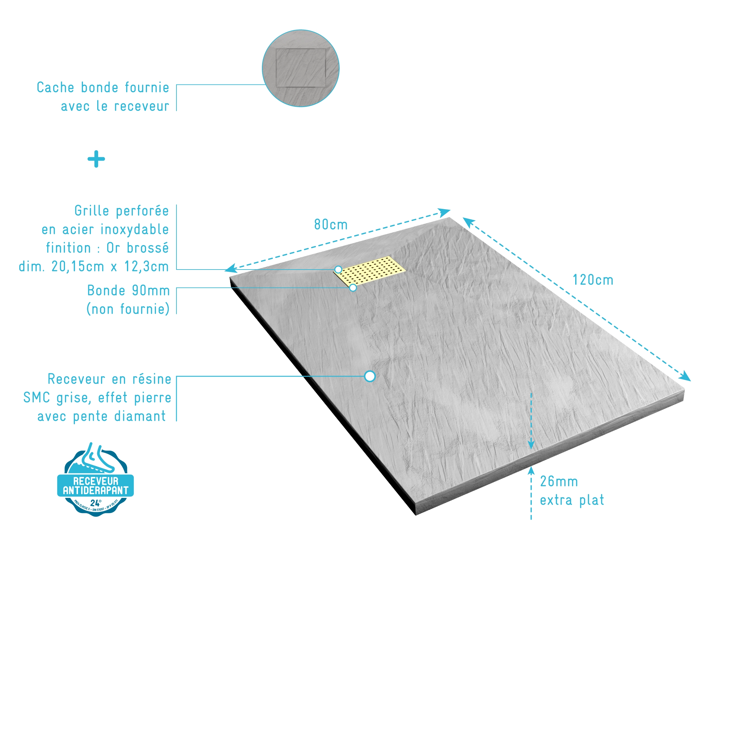 Receveur de douche Gris Effet Pierre 80×120 cm et Grille décor Perforée Or Doré Brossé