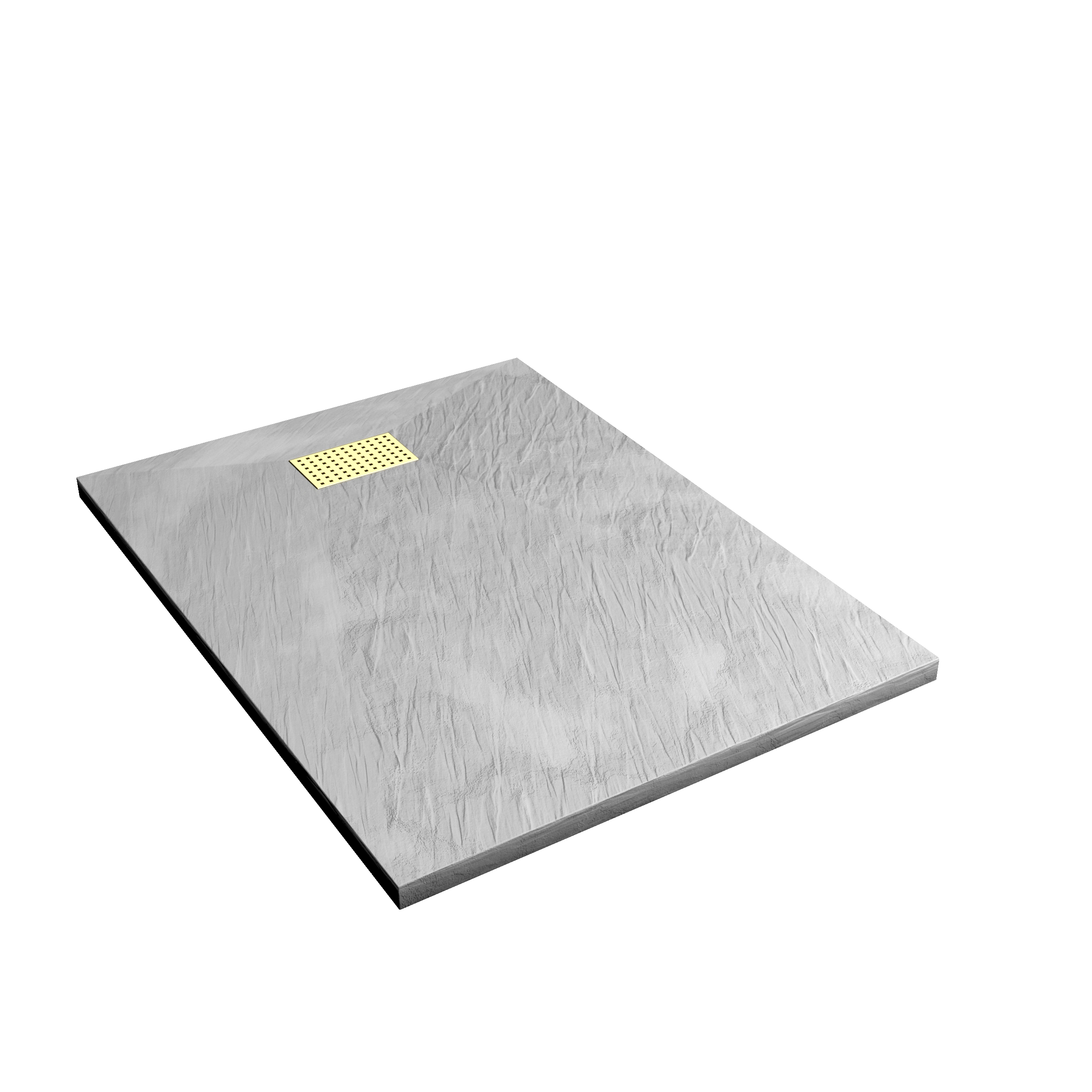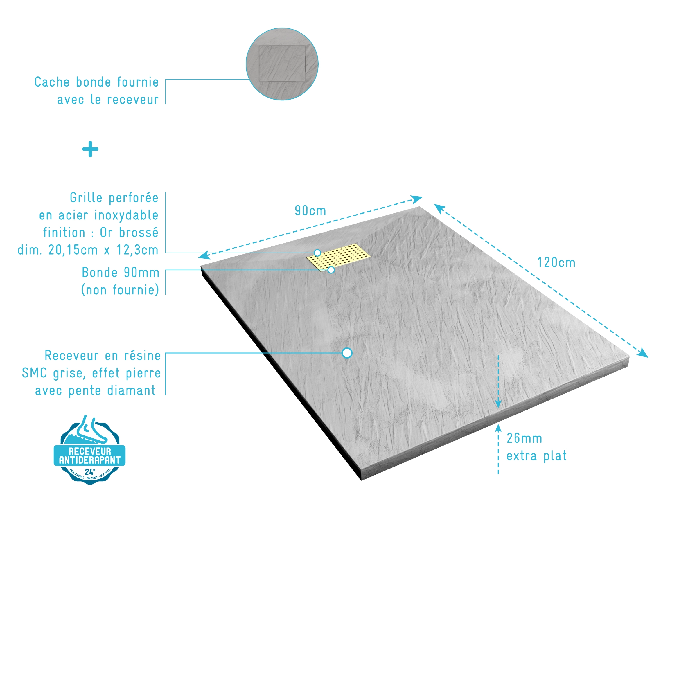 Receveur de douche Gris Effet Pierre 90×120 cm et Grille décor Perforée Or Doré Brossé