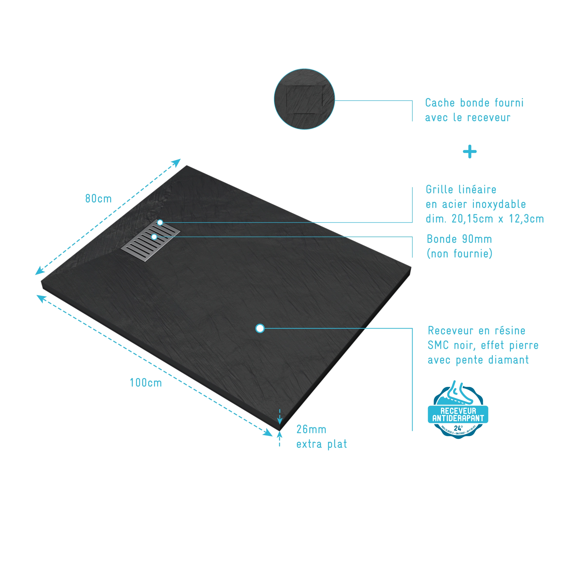 Receveur de douche Noir Effet Pierre 80×100 cm et Grille décor Linéaire en Inox