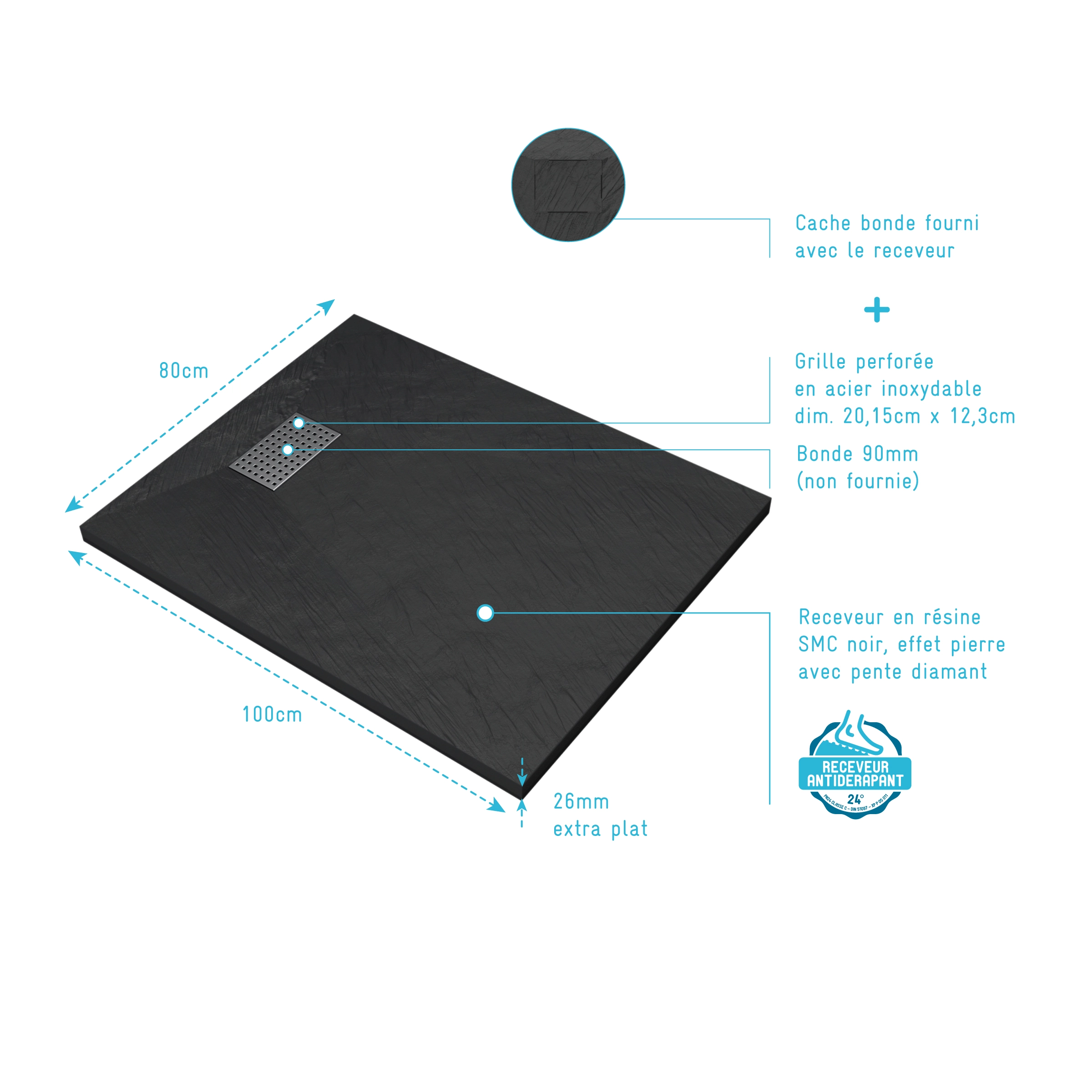 Receveur de douche Noir Effet Pierre 80×100 cm et Grille décor Perforée en Inox