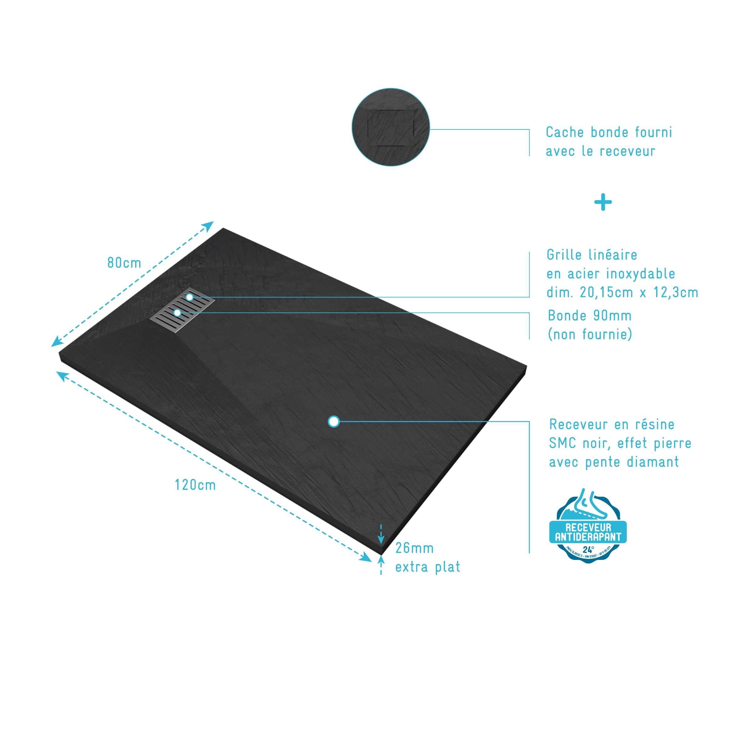 Receveur de douche Noir Effet Pierre 80×120 cm et Grille décor Linéaire en Inox