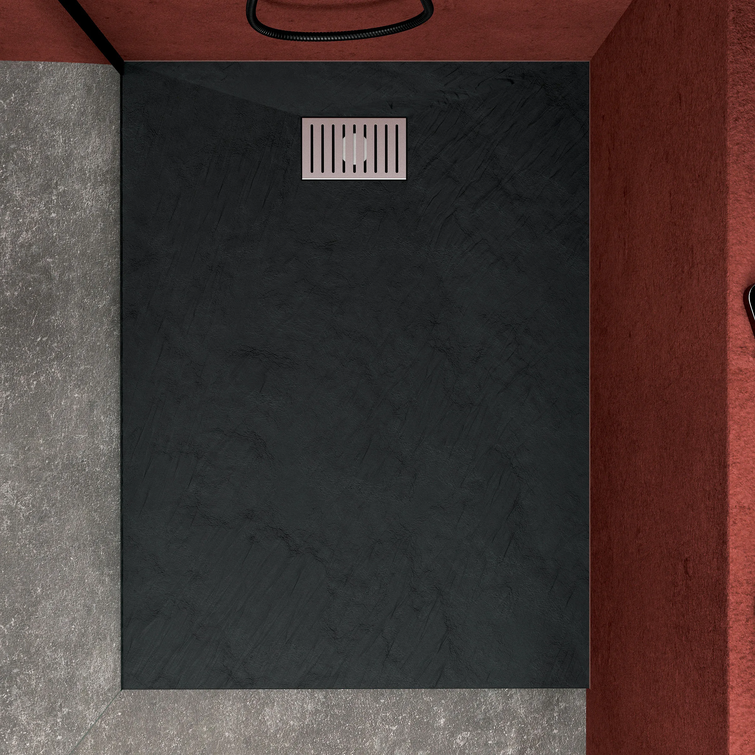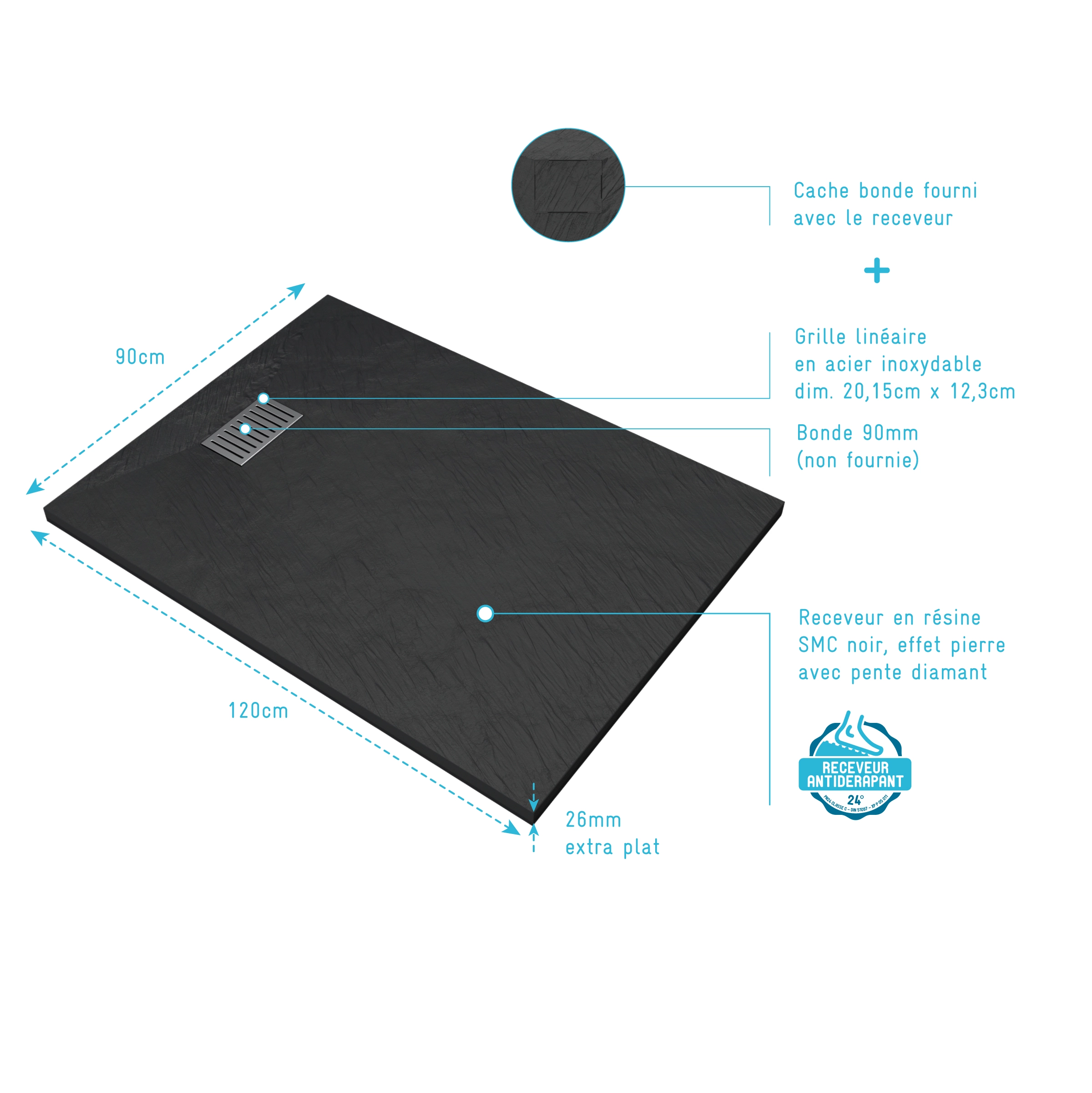 Receveur de douche Noir Effet Pierre 90×120 cm et Grille décor Linéaire en Inox