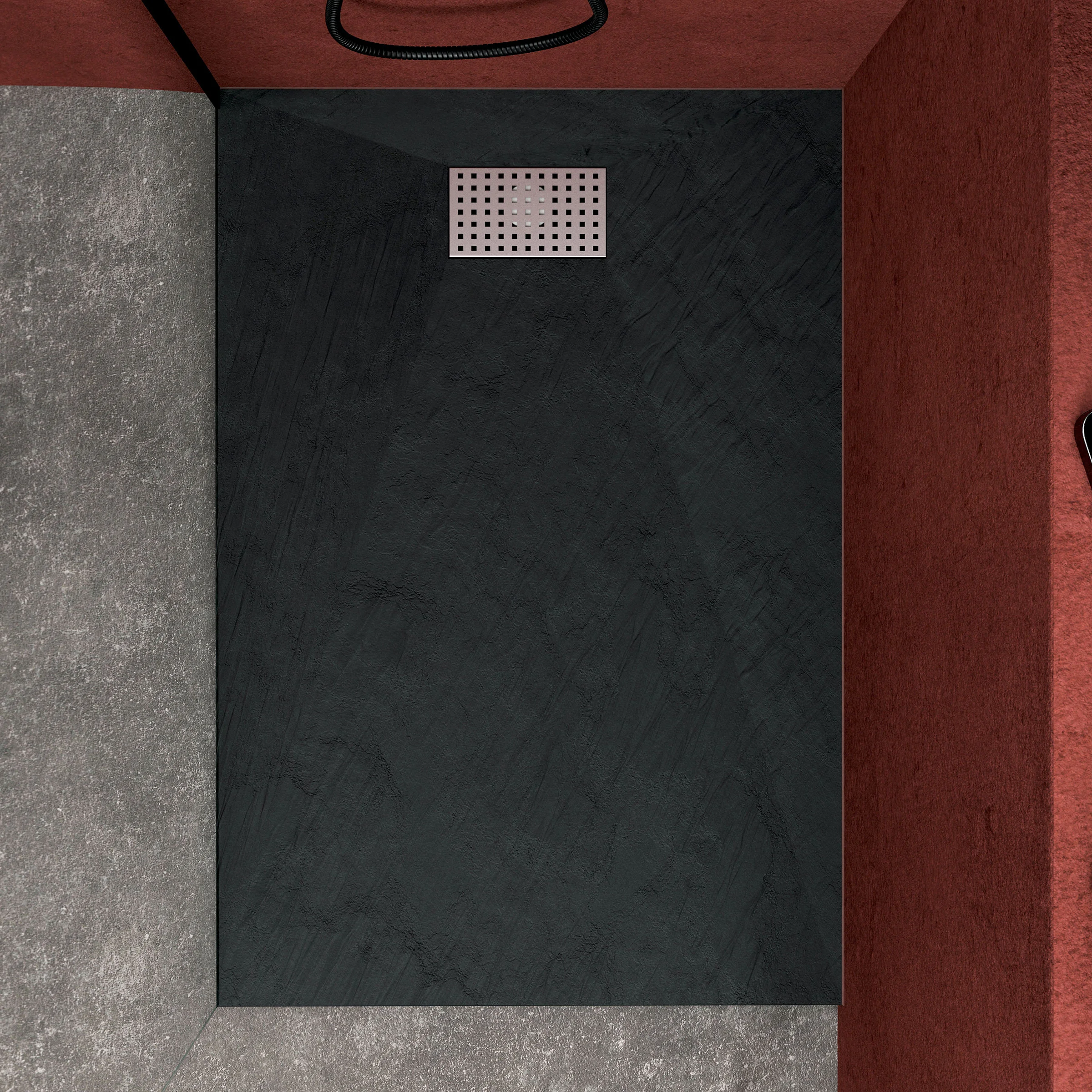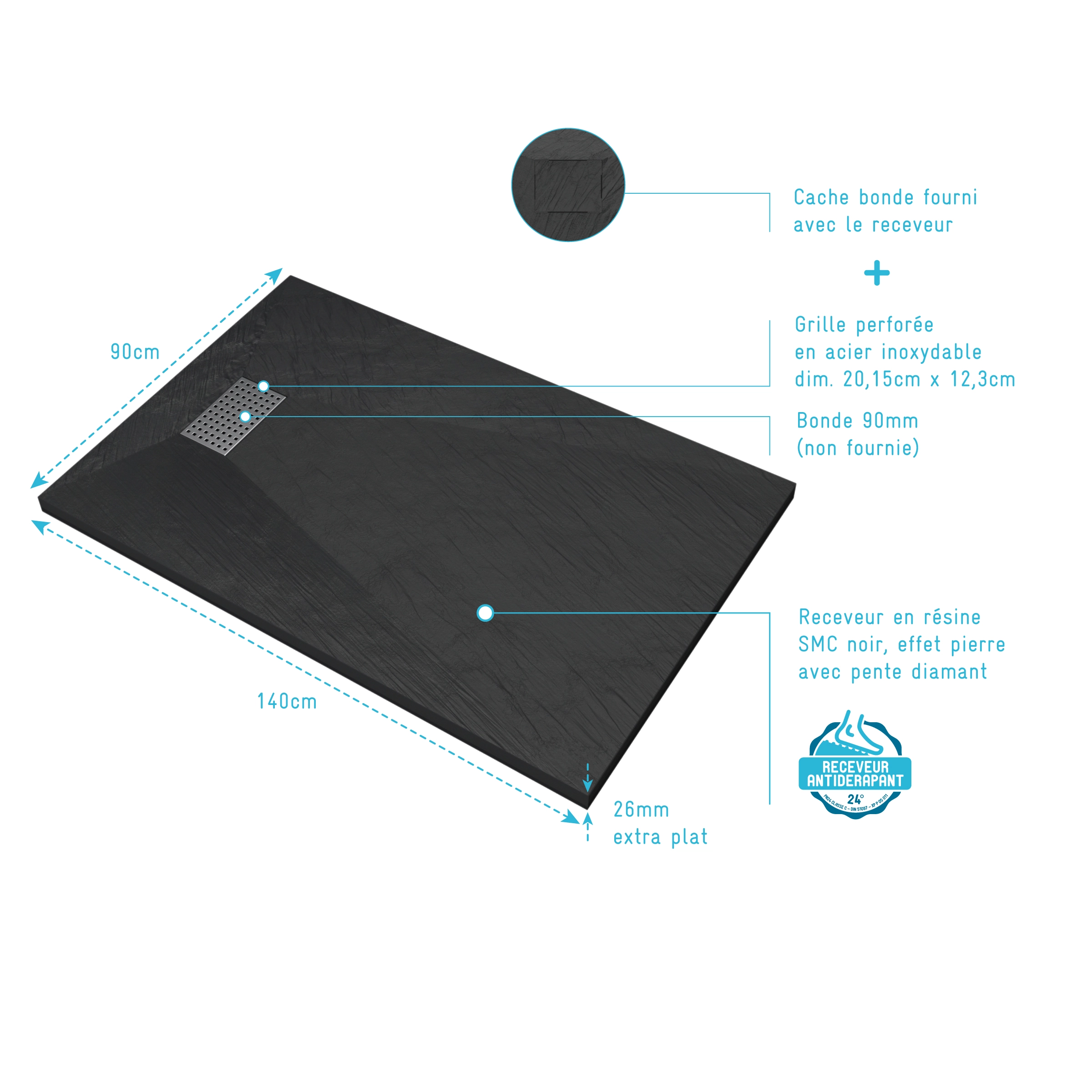 Receveur de douche Noir Effet Pierre 90x140 cm et Grille décor Perforée en Inox