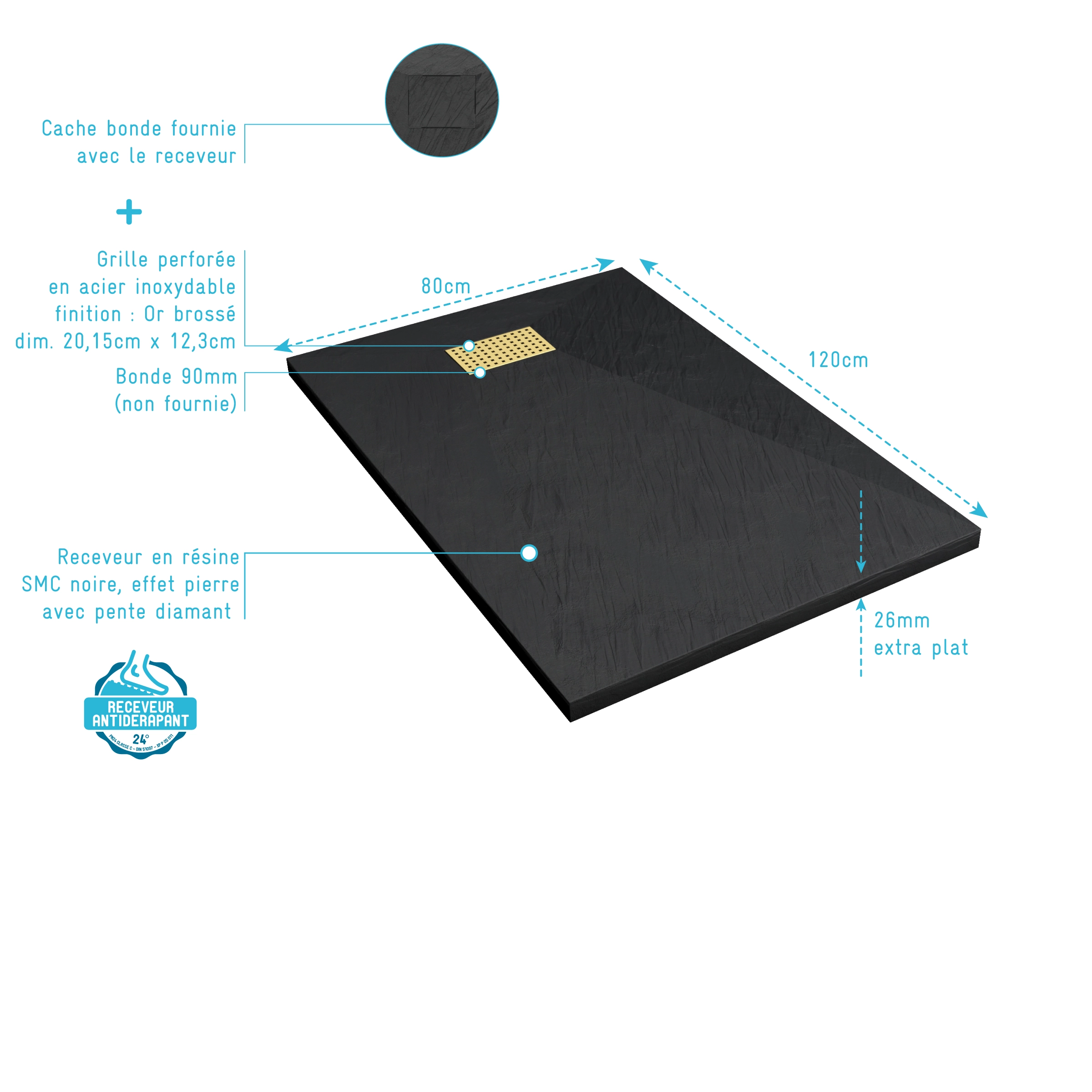 Receveur de douche Noir Effet Pierre 80×120 cm et Grille décor Perforée Or Doré Brossé