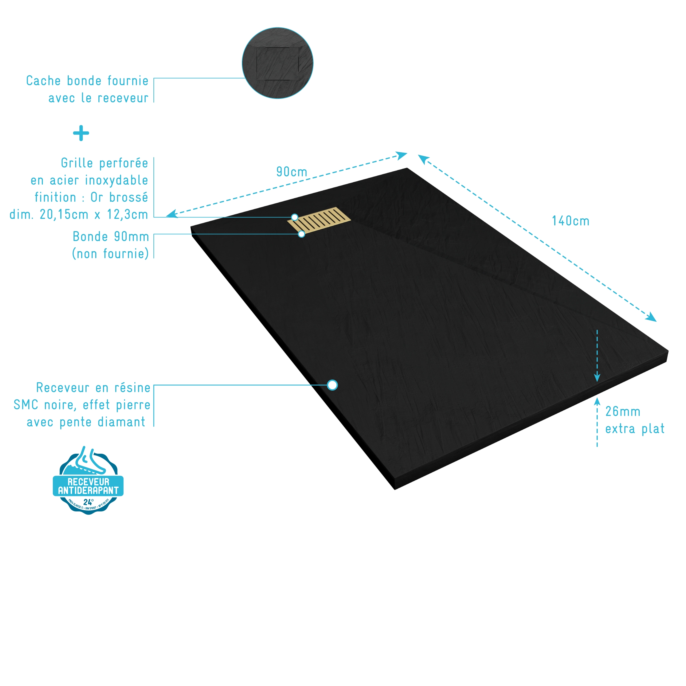 Receveur de douche Noir Effet Pierre 90×140 cm et Grille décor Linéaire Or Doré Brossé