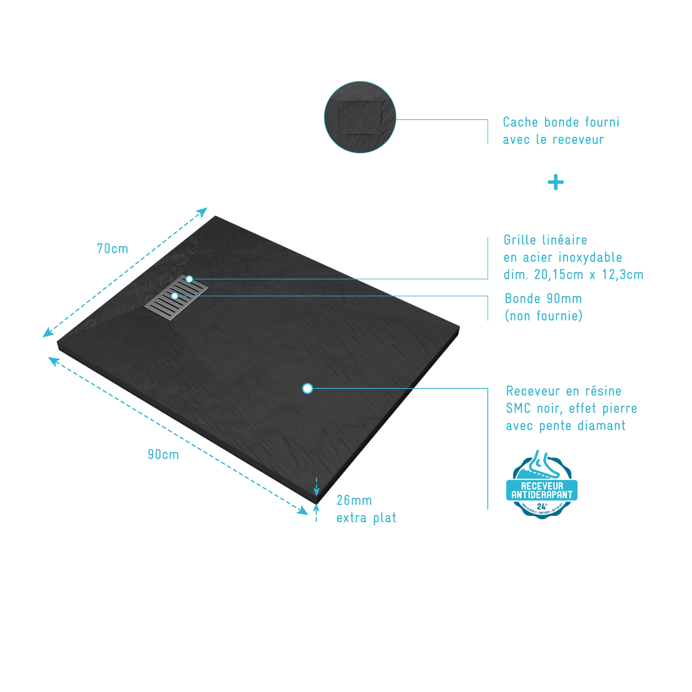 0 avis ROCK 2 Receveur de douche Noir Effet Pierre 70x90 cm et Grille décor Perforée en Inox