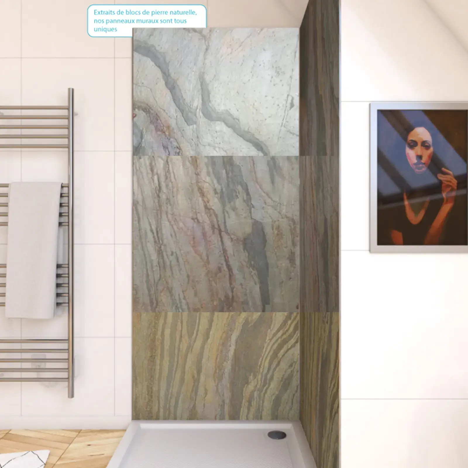 Les panneaux STONE’IT sont constitués d’une fine feuille de pierre ou mica selon les modèles. Cette strate est renforcée avec de la résine polyester et de la fibre de verre. Extraits de blocs de pierre naturelle, nos panneaux muraux sont tous uniques. Chaque bloc de pierre possède ses propres variations de texture et de couleur, ce qui permet à chaque panneau de s’adapter parfaitement à votre salle de bain. Retrouvez les différents résultats possibles parmi les photos et appréciez la diversité ainsi que la beauté de chaque panneau. Cette unicité garantit une décoration authentique et personnalisée pour votre intérieur.