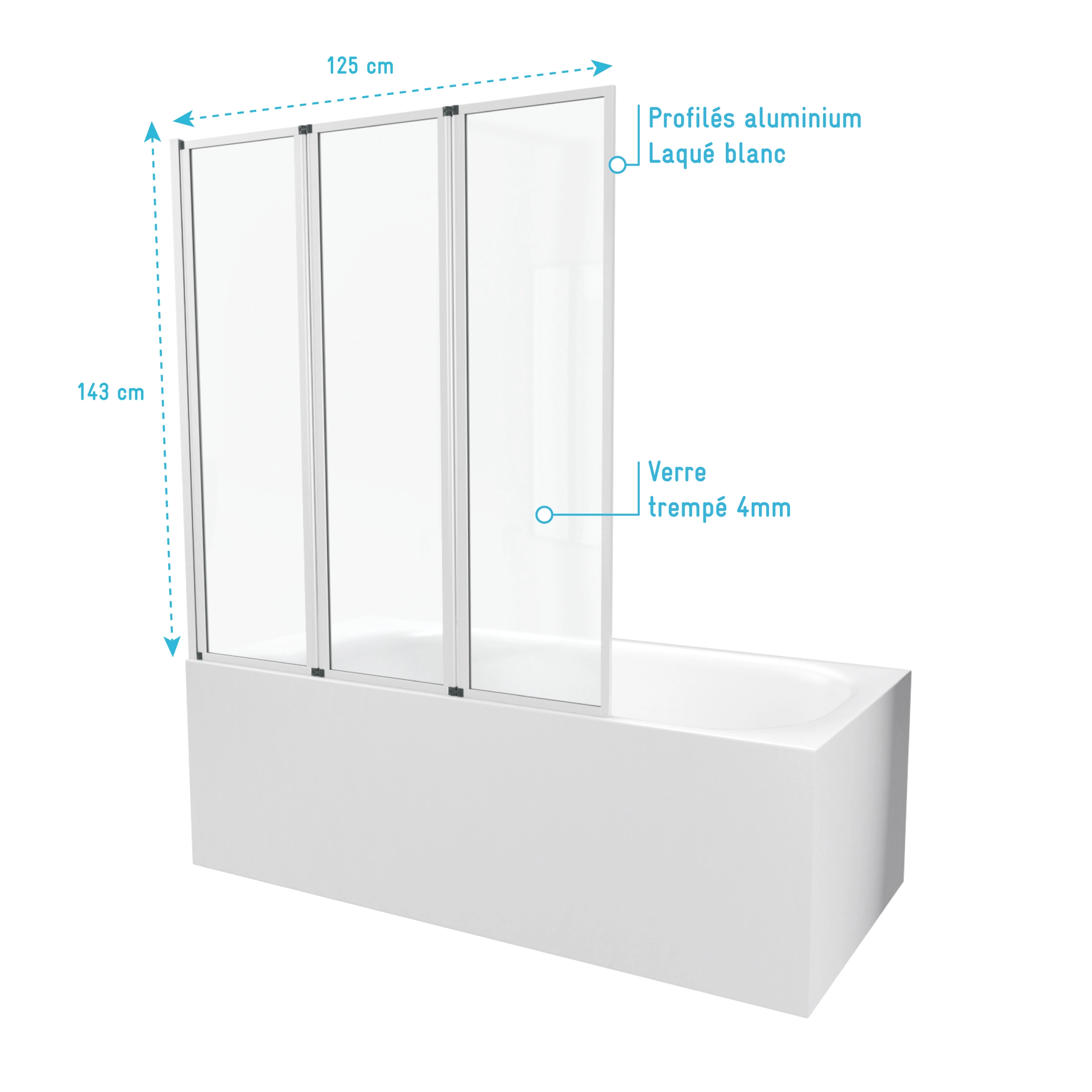 Pare baignoire Pivotant 3 Volets Blanc – 125×143 cm – Verre Trempé 4 mm – ZAGGY WHITE