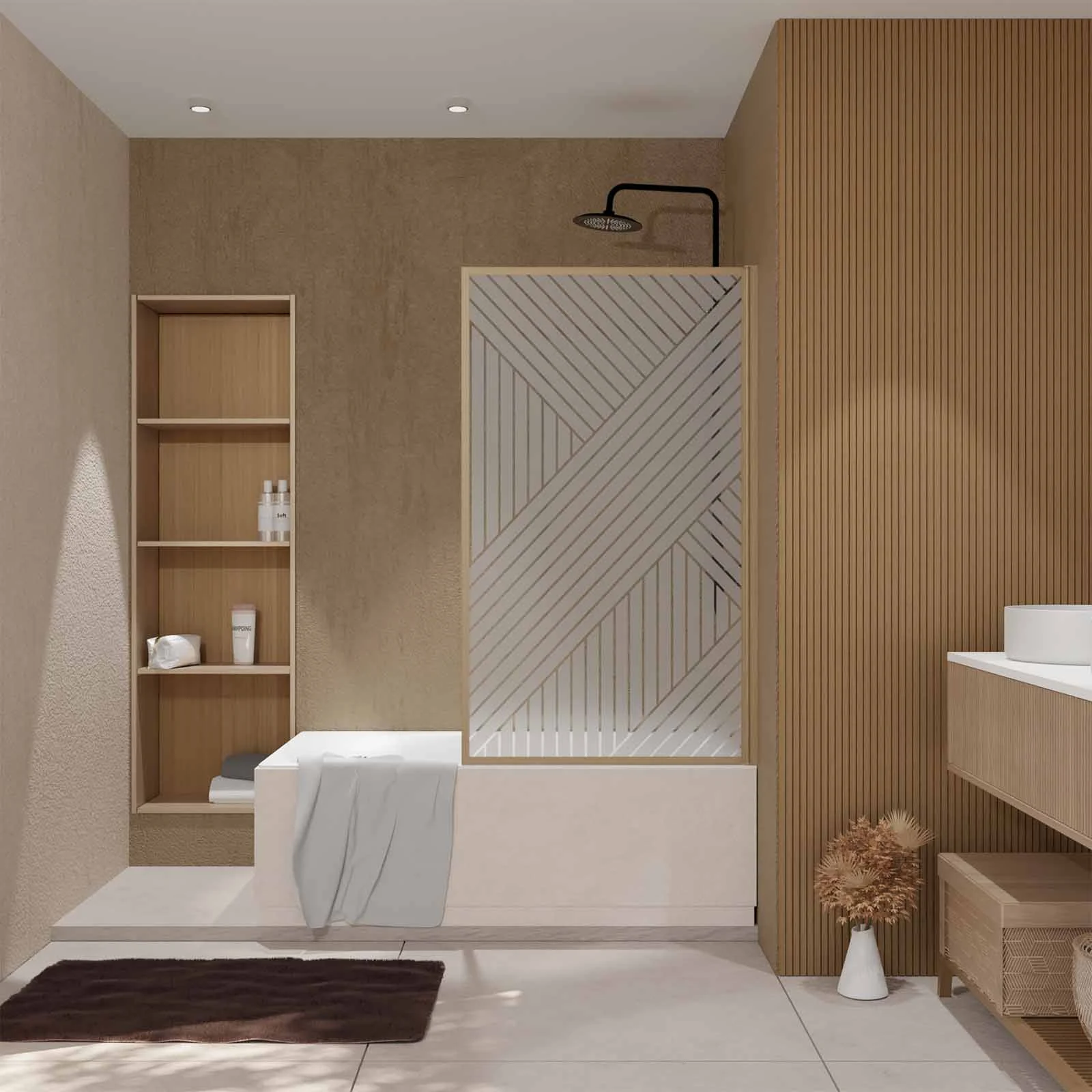 4 avis pour Pare baignoire pivotant 140×80 cm HINATA – style Japandi géométrique – Cadre effet bois – Verre 5 mm