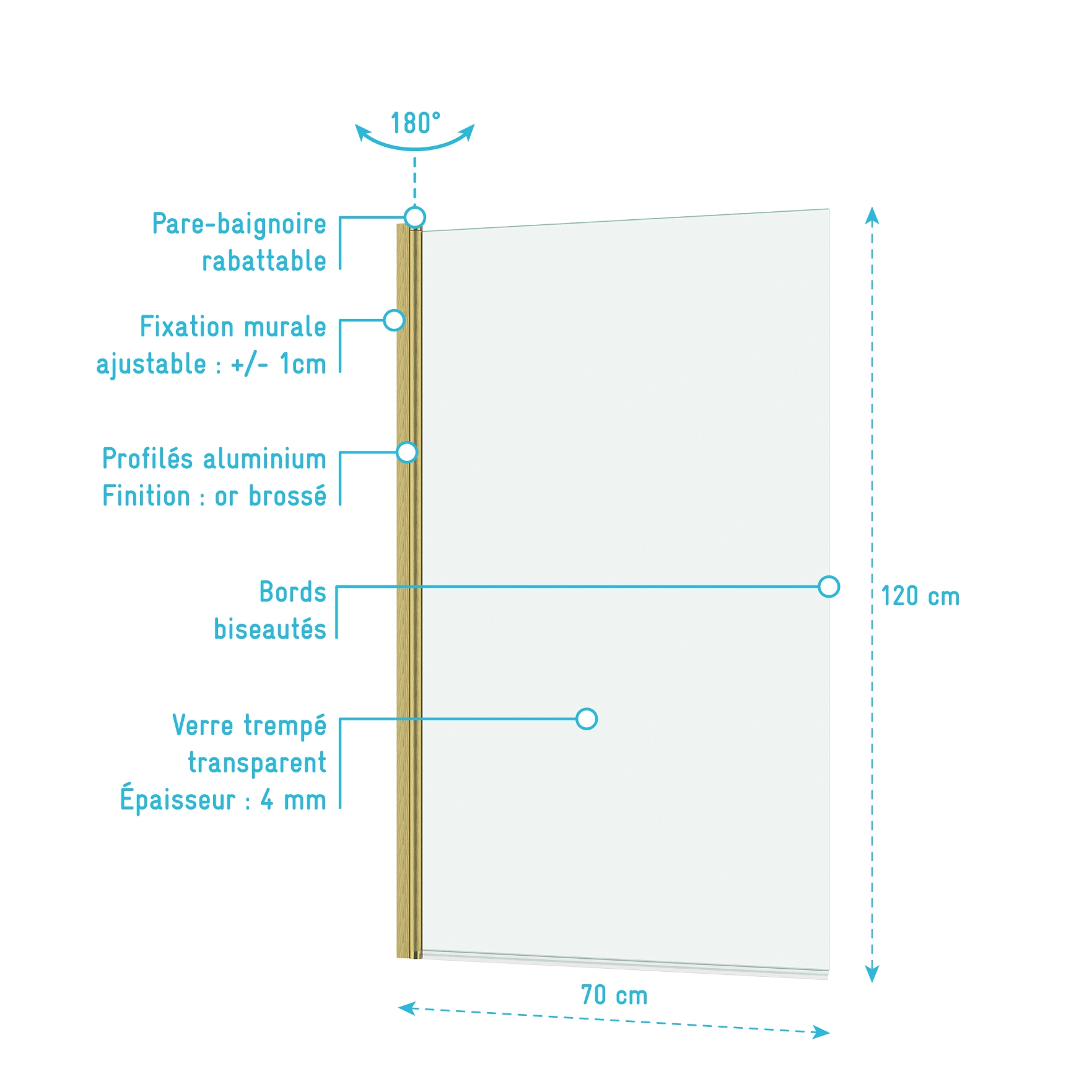 Pare baignoire Rabattable 70x120cm – Profilé finition Or Doré Brossé – Verre Trempé 4mm – ELEMENTARY