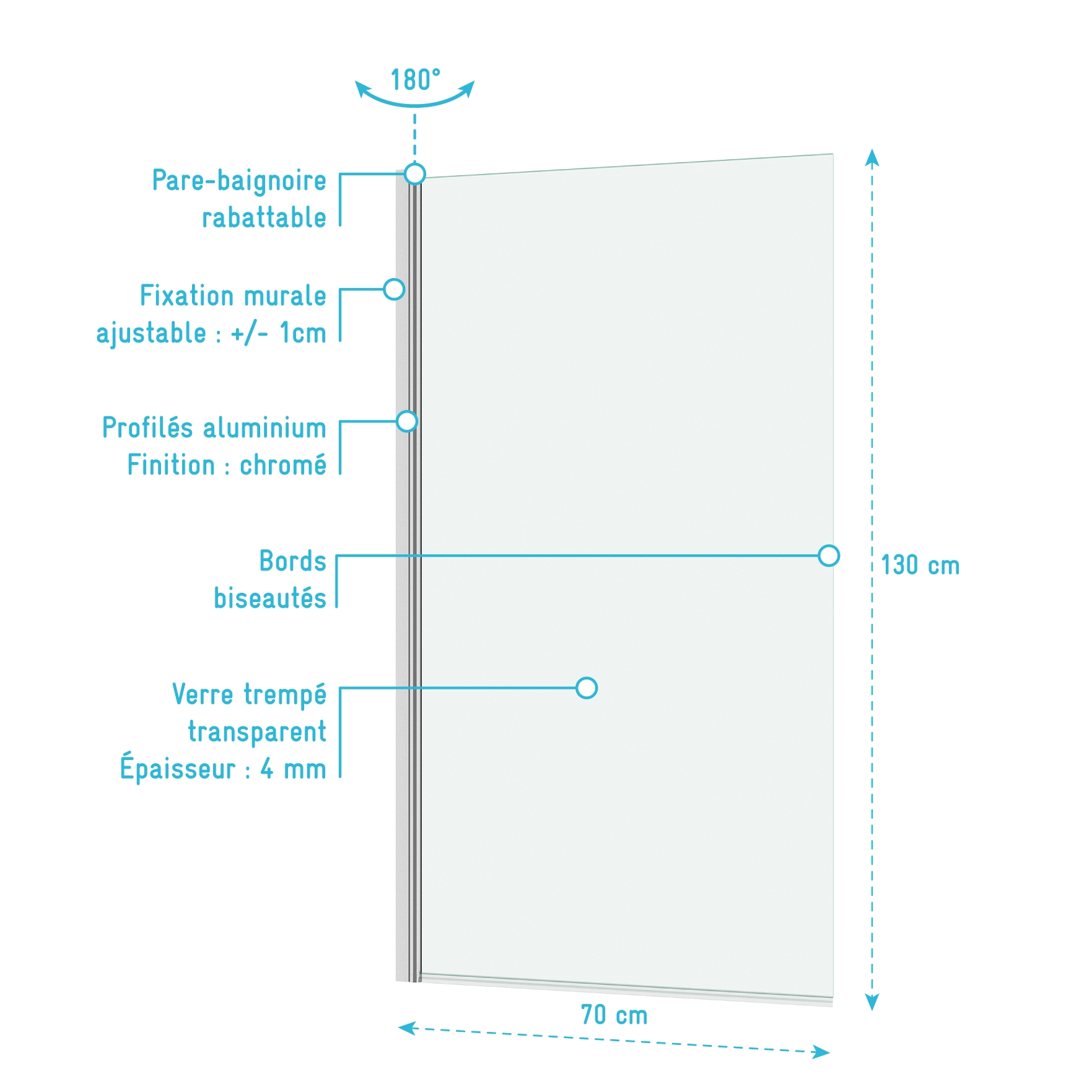 Pare baignoire Rabattable 70x130cm – Profilé Chromé – Verre Trempé 4mm – ELEMENTARY