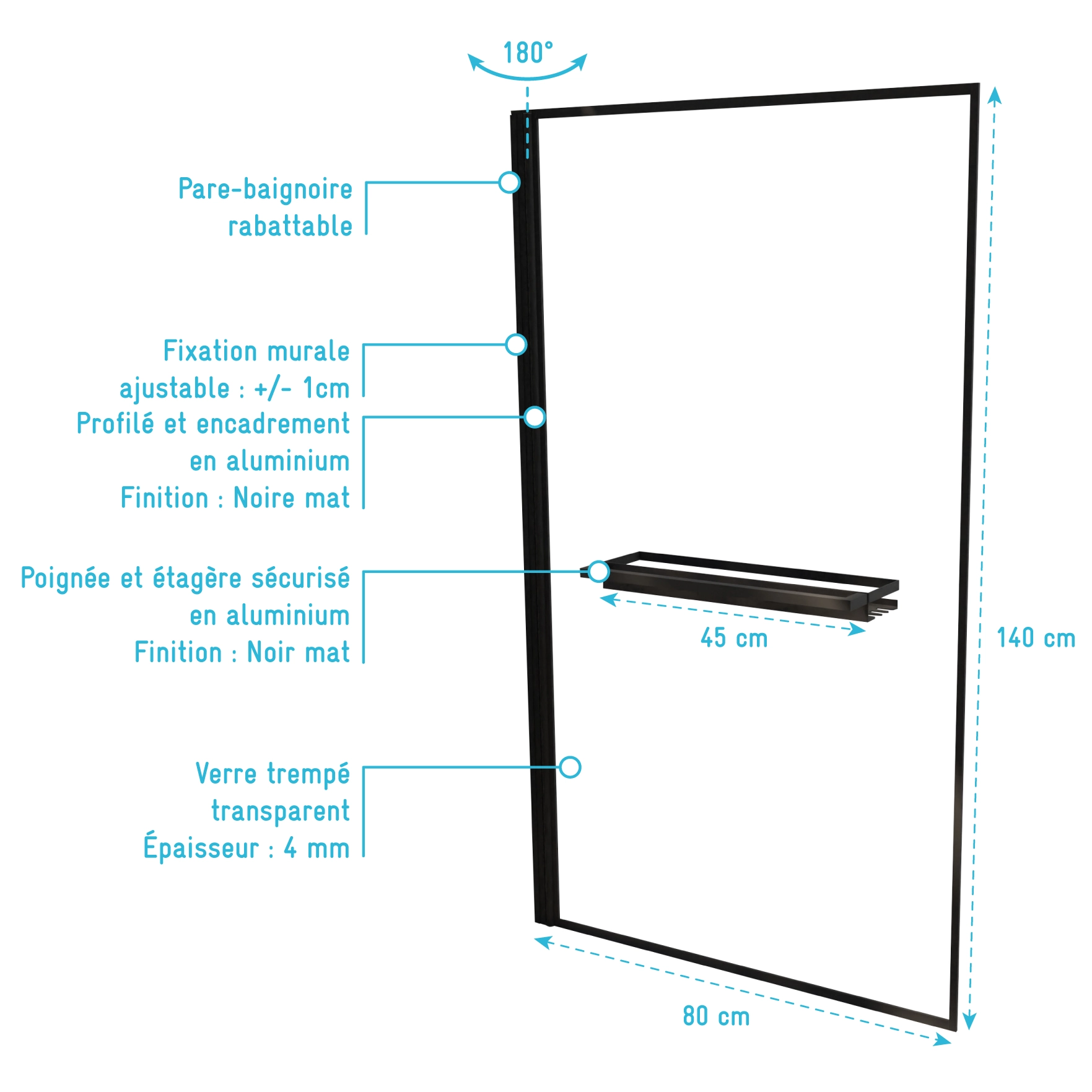 0 avis CONTOURING SCREEN SHELF Pare baignoire Rabattable 80x140 cm en Verre Trempé - Porte-Serviette et Etagère Noir Mat