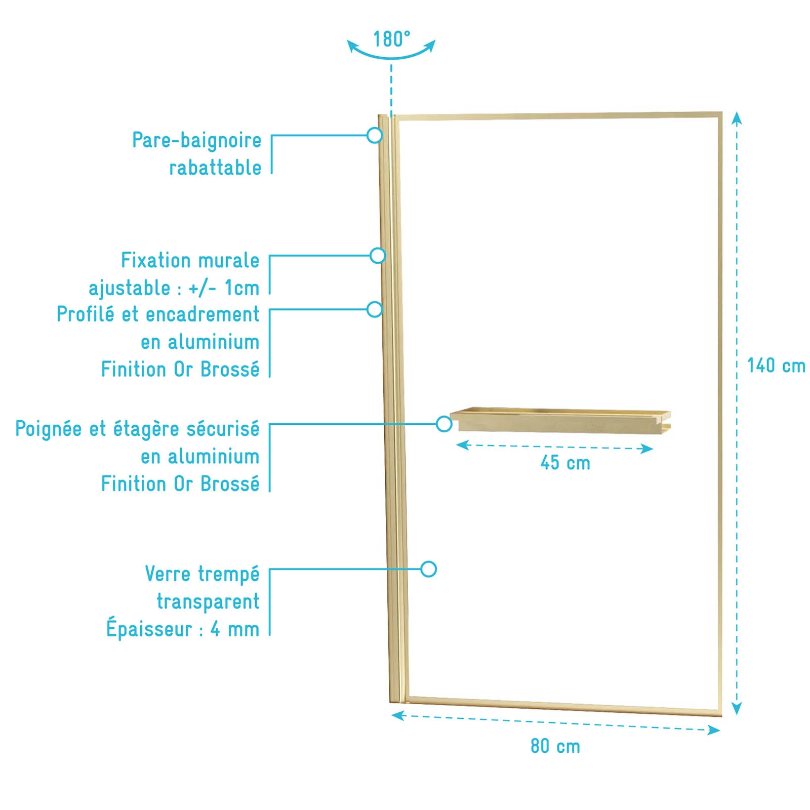 Pare baignoire Rabattable 80x140cm en Verre trempé – Porte-serviette et Etagère Or Doré Brossé