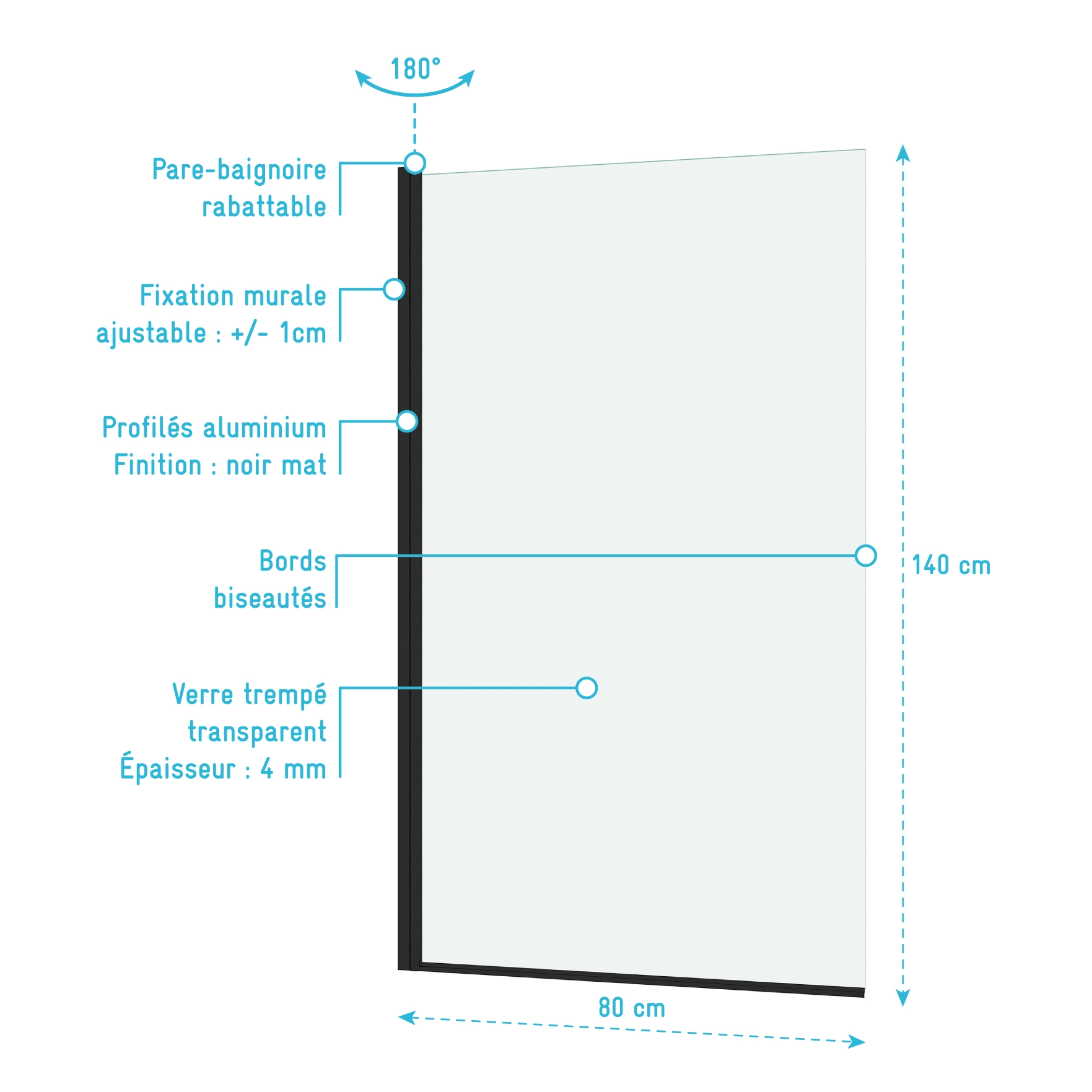 Pare baignoire Rabattable 80x140cm – Profilé Noir Mat – Verre Trempé 4mm – ELEMENTARY