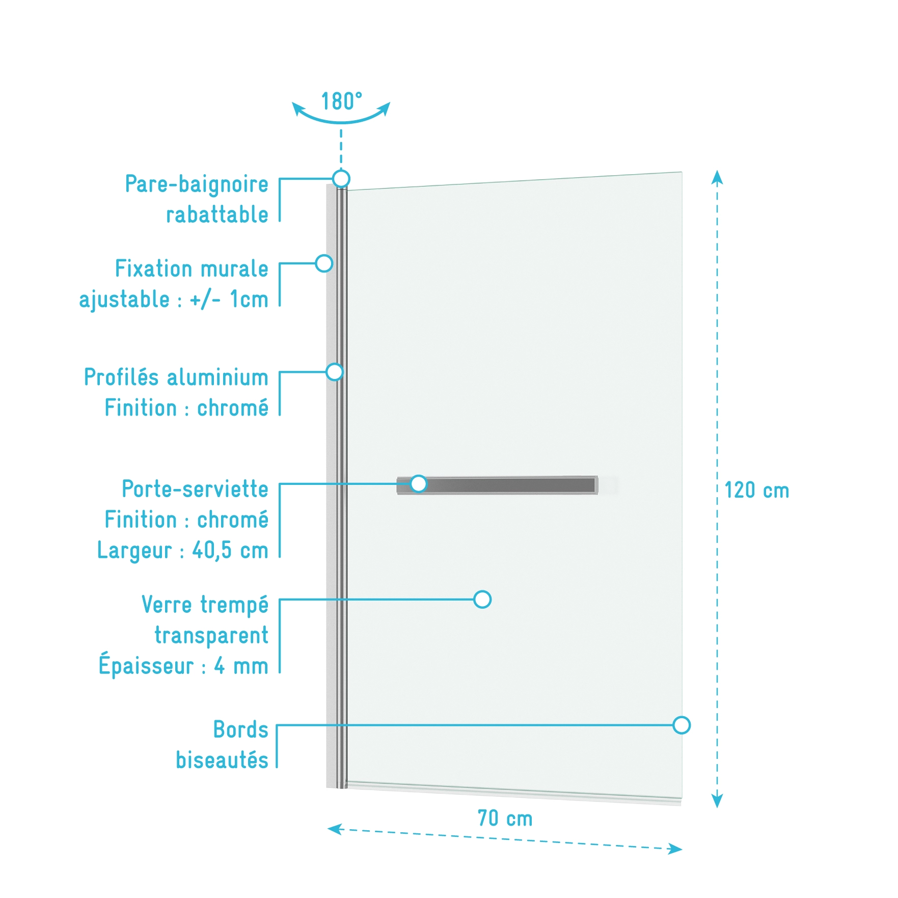 4 avis pour Pare baignoire Rabattable avec porte-serviette 70×120 cm – Profilé Chromé – Verre 4 mm