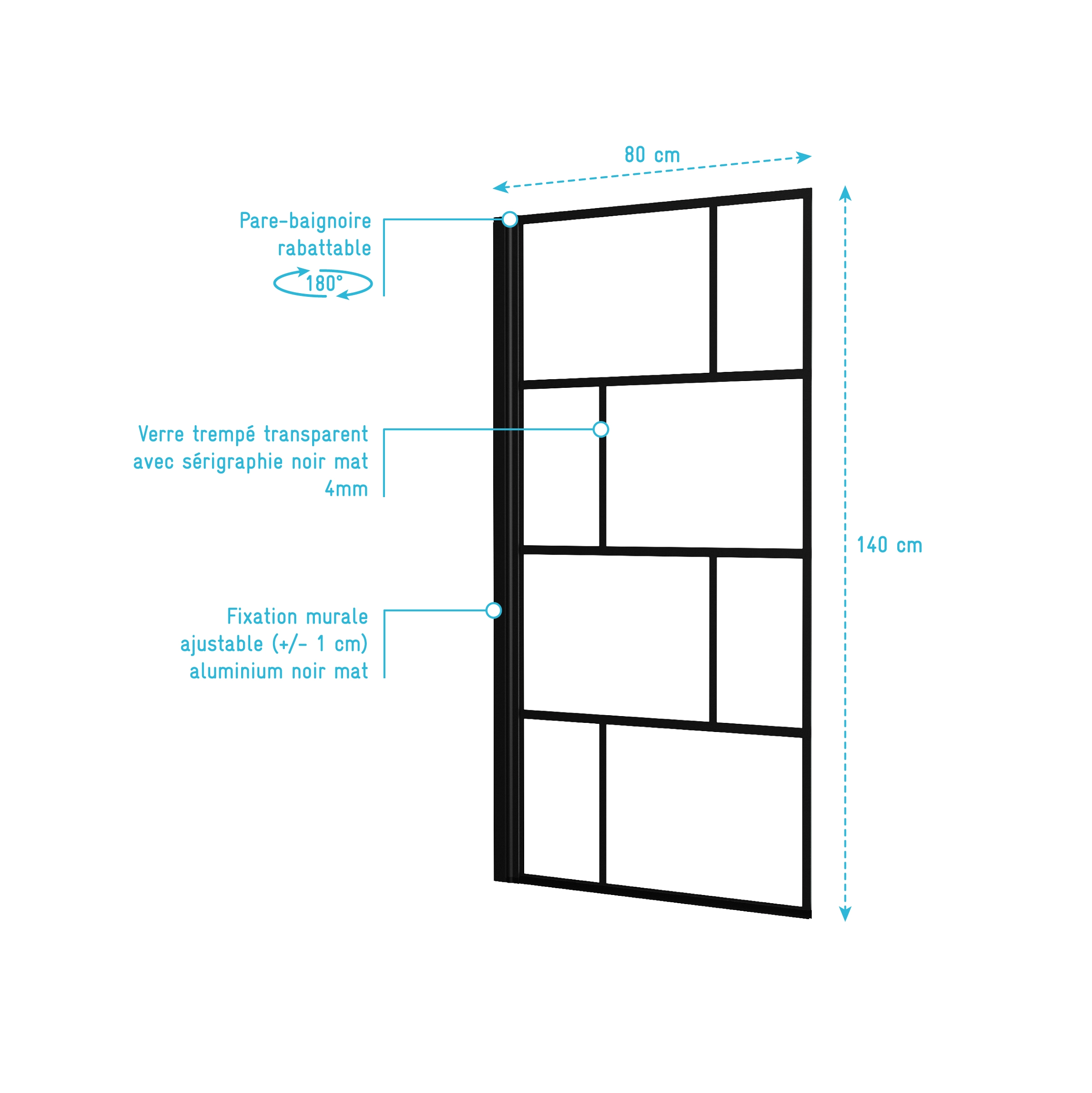 8 avis pour Pare baignoire rabattable sérigraphié 80×140 cm – Finition Noir Mat – BLOCKS SCREEN