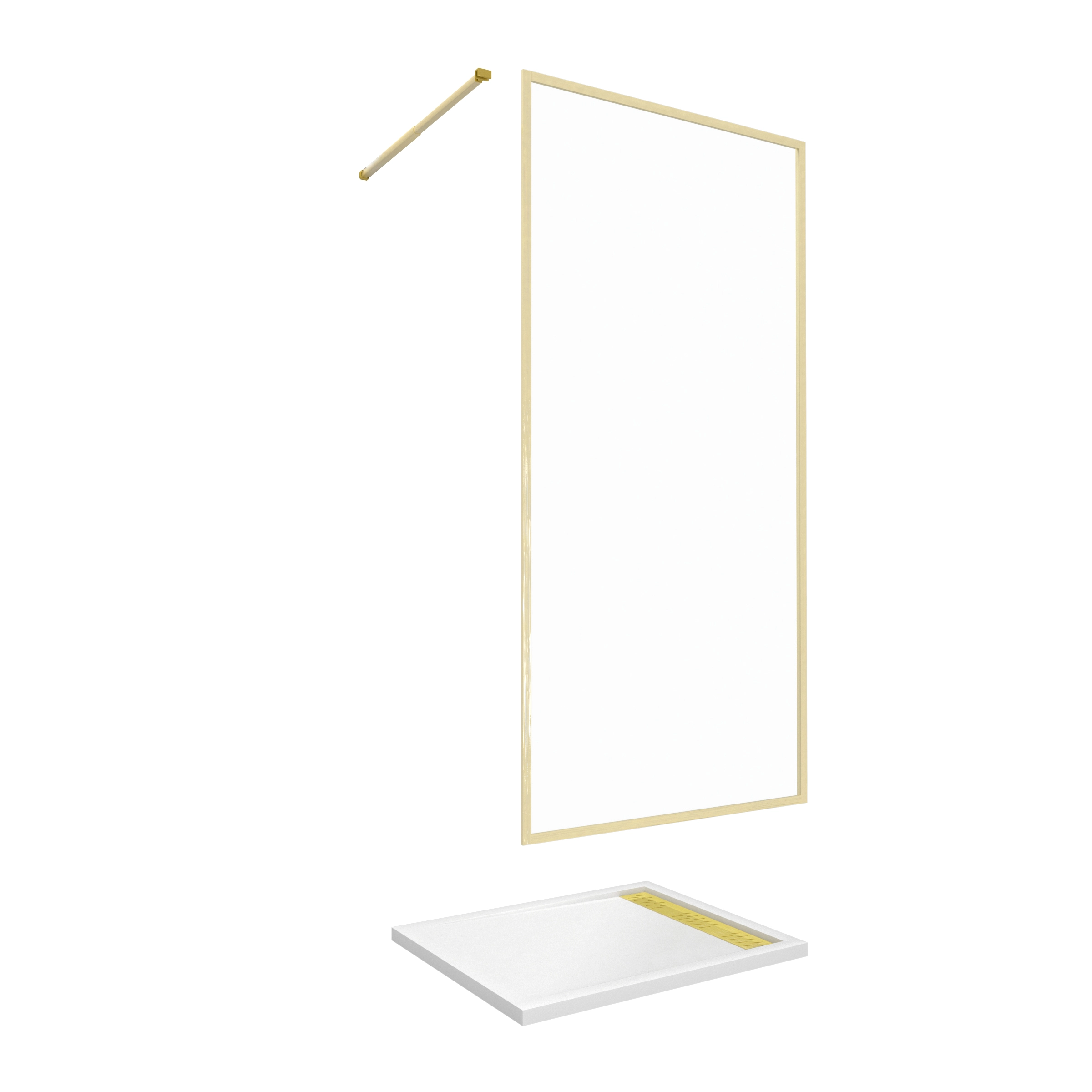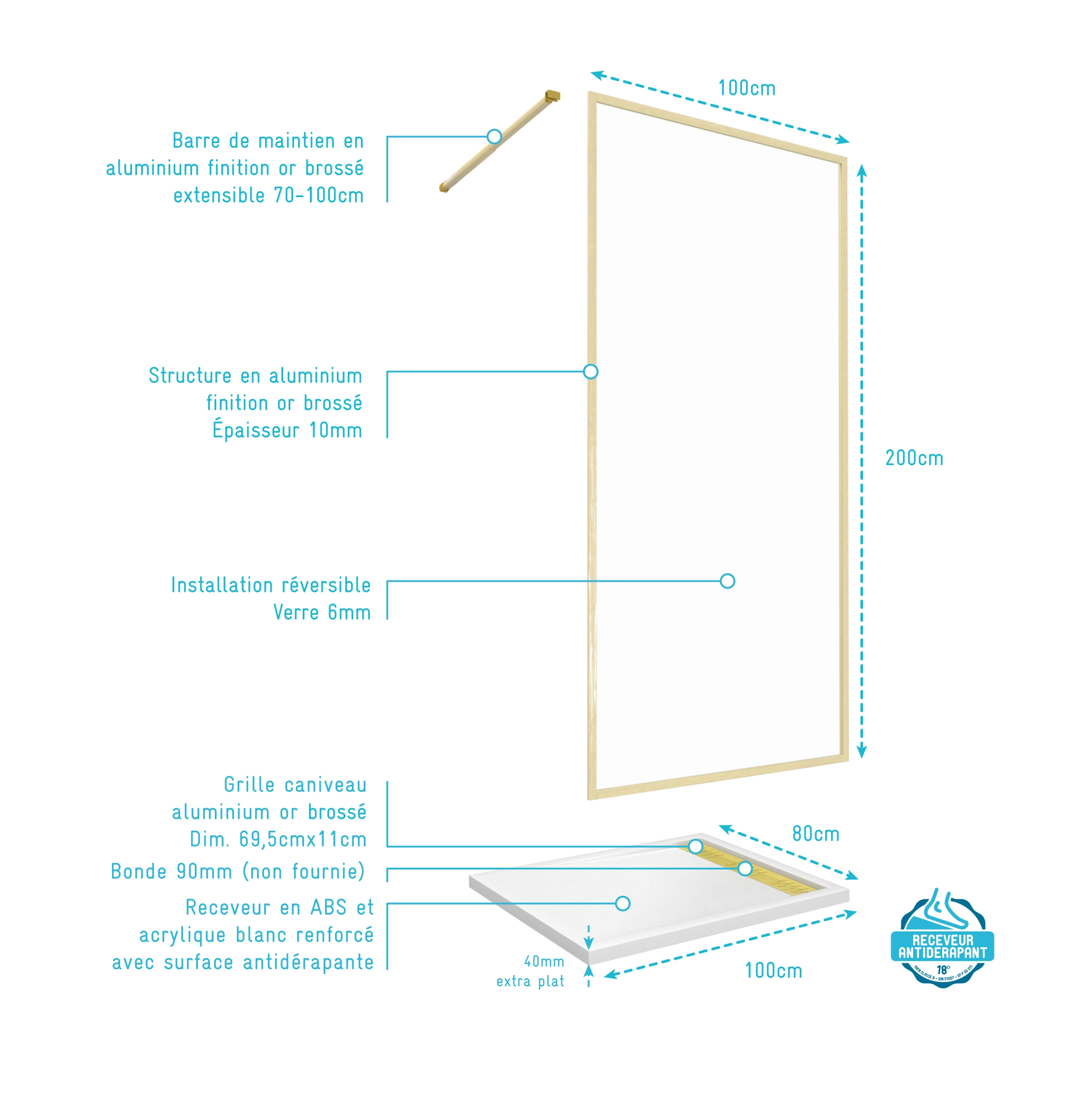 Paroi de Douche 100x200cm + Grille Finition Or Doré Brossé + Receveur Blanc 100x80x4cm
