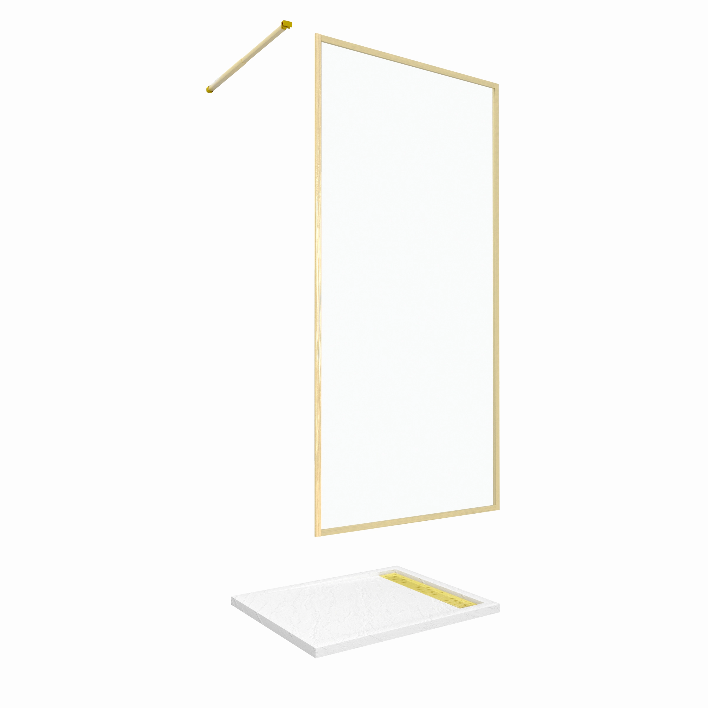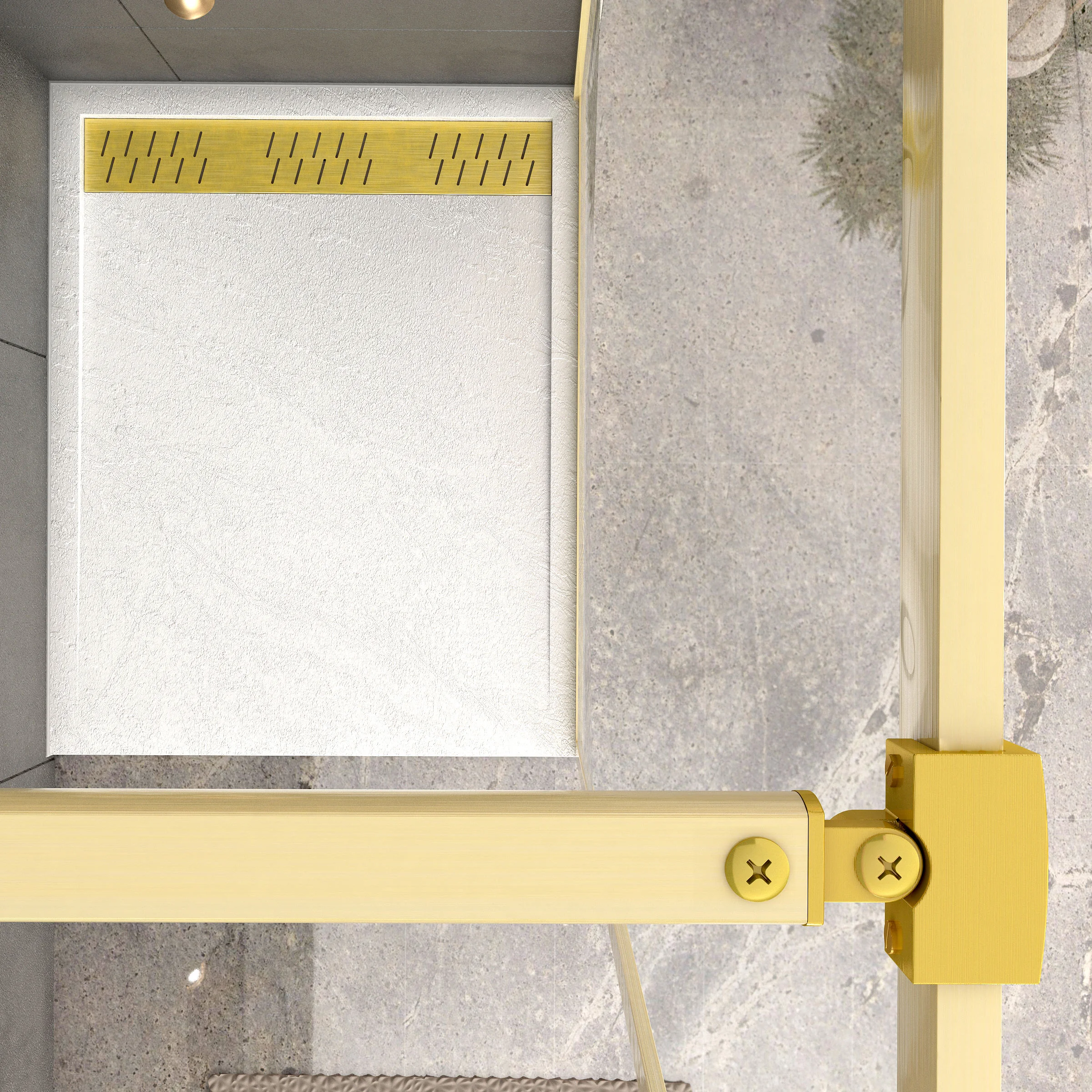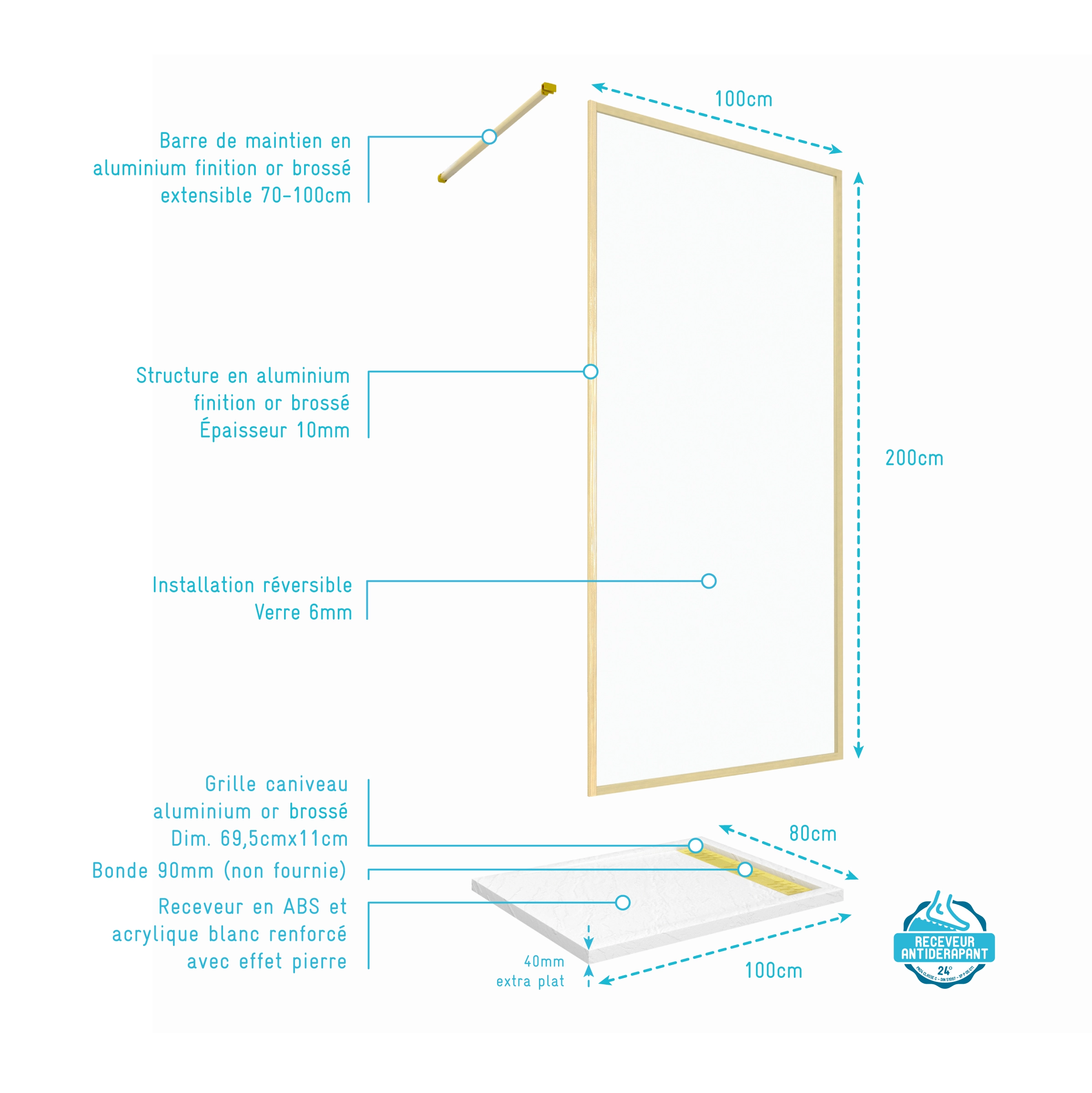Paroi de Douche 100x200cm + Grille Finition Or Doré Brossé + Receveur Blanc effet pierre 100x80x4cm