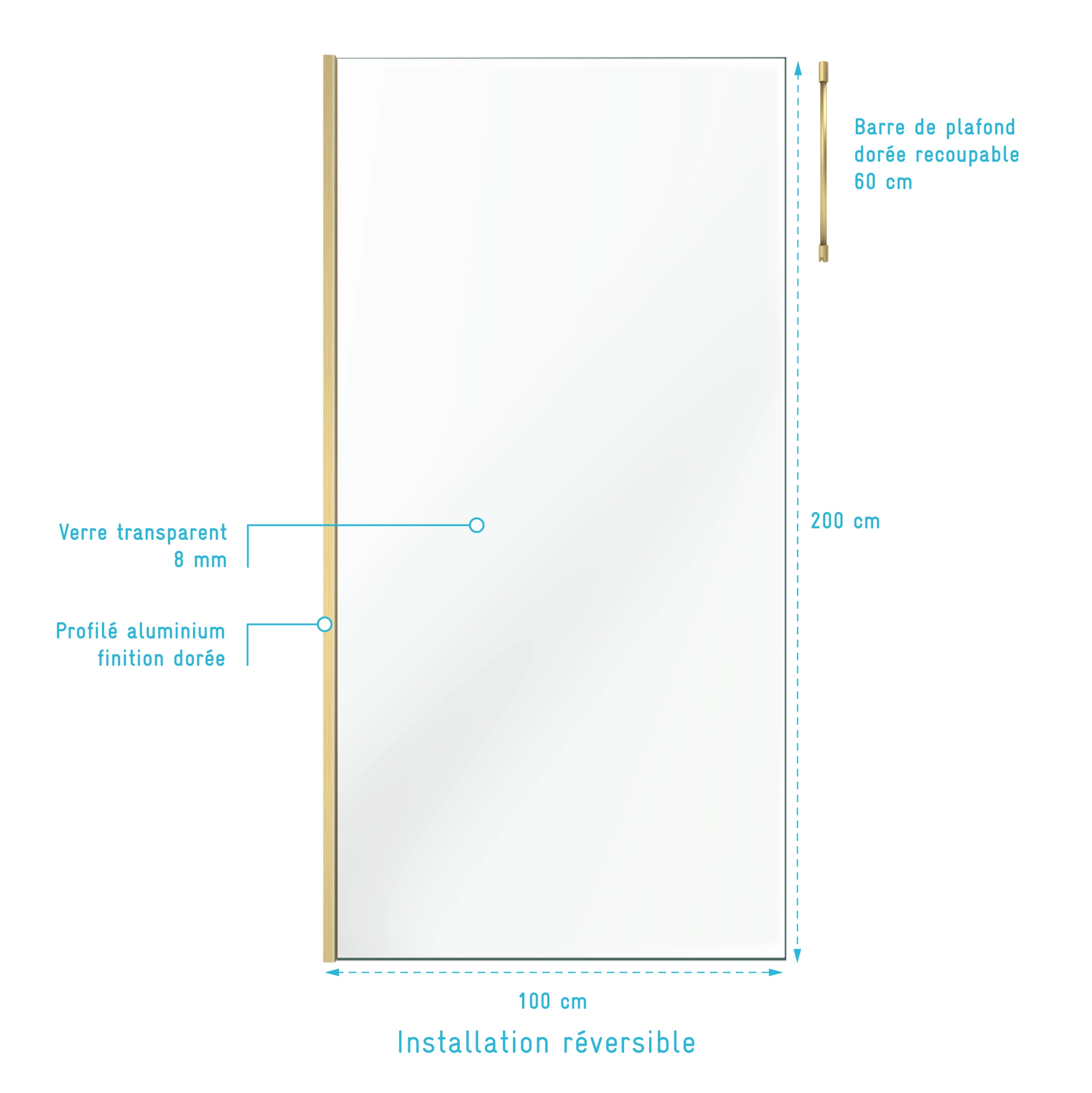 1 avis pour Paroi de Douche 100x200cm Verre 8mm – Profilé + Barre Plafond Finition Or Brossé – FREEDOM 2 GOLD