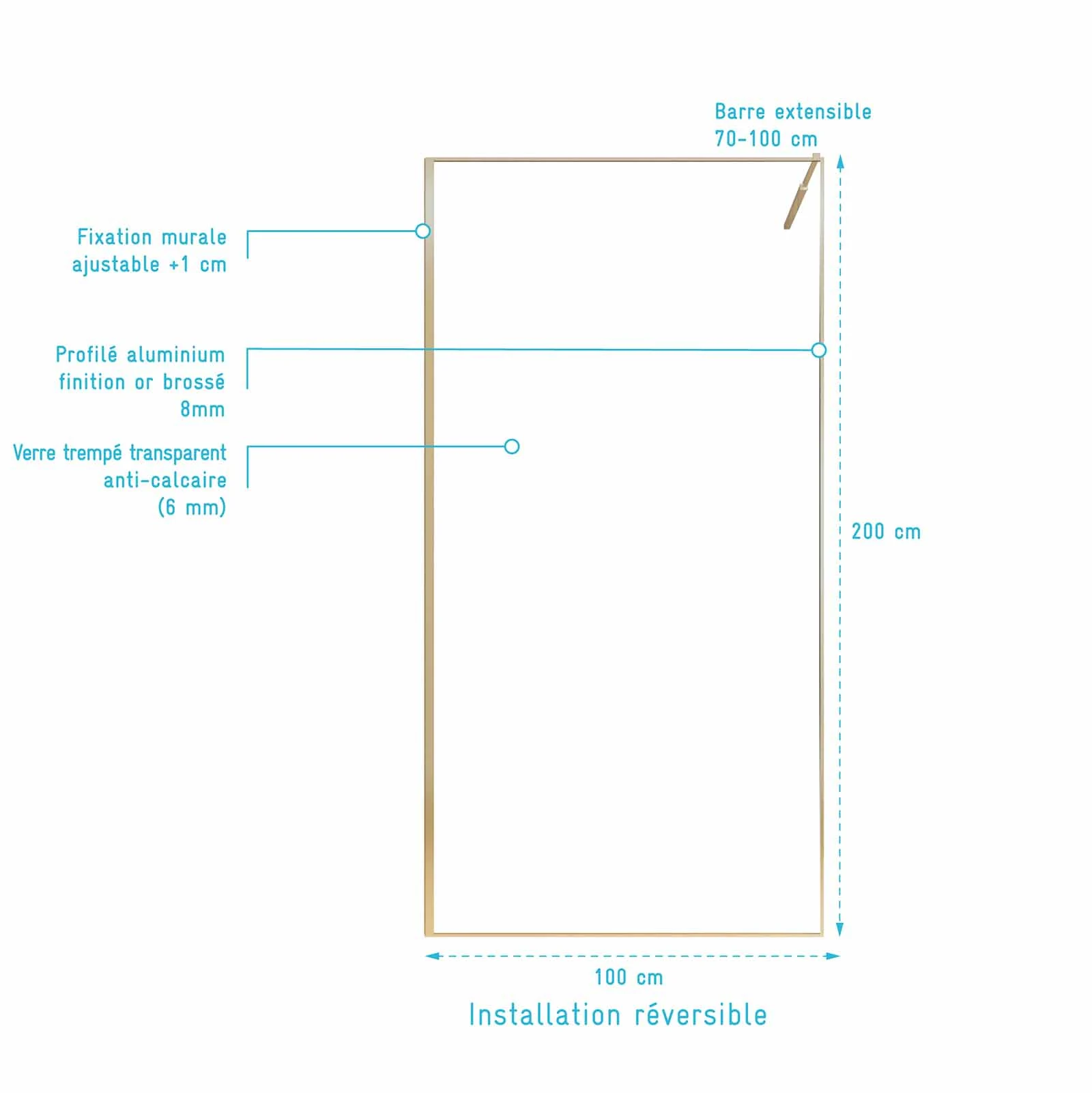 Paroi de Douche 100x200cm – Verre Anticalcaire – Encadrement Ultra-Fin – Finition Or Brossé – LEA