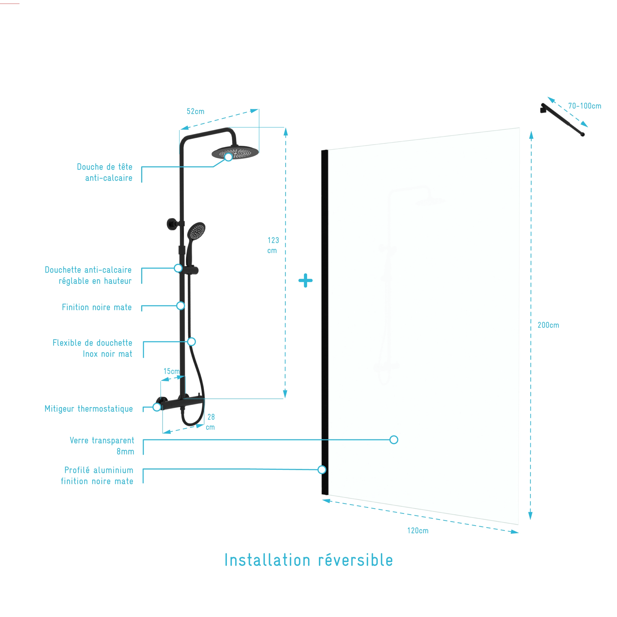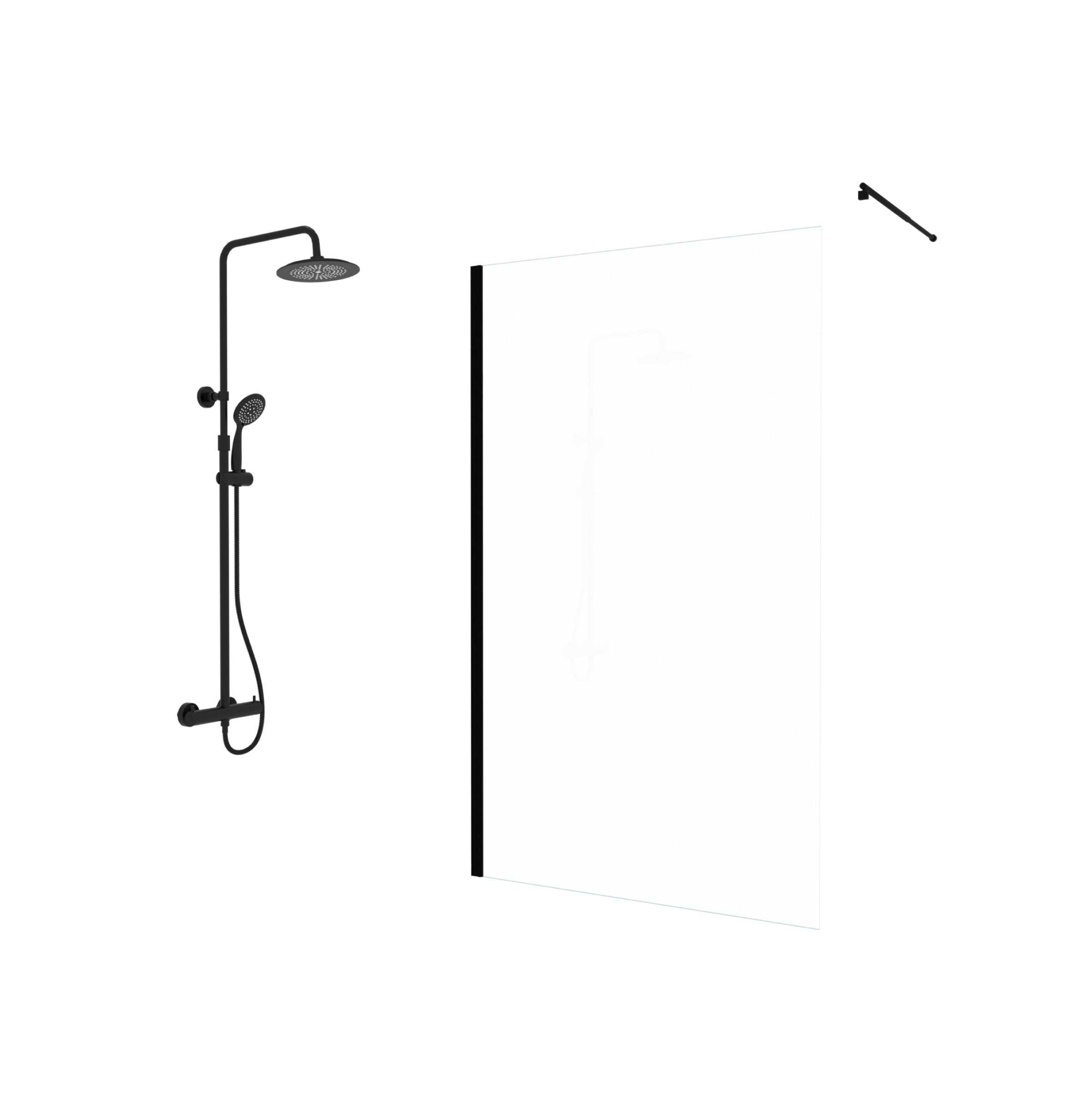 Paroi de Douche 120cm Verre 8mm – Profilé + Bras extensible + Colonne Thermostatique NOIR MAT