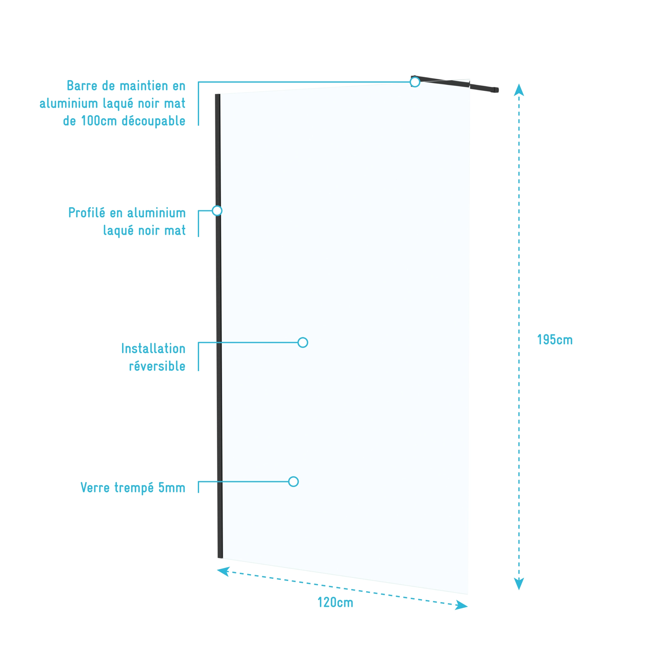 Paroi de Douche 120×195 cm en Verre Trempé 5 mm – Finition Noire – DARK ELEMENTARY