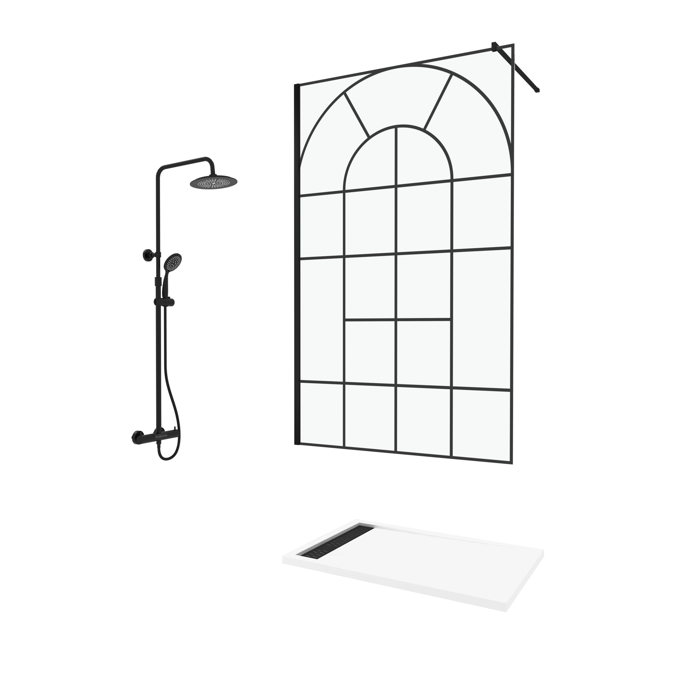 Ensemble comprenant une paroi de douche motif verrière en verre trempé, un receveur en acrylique Blanc à grille linéaire et une colonne de douche équipée d’un mitigeur Thermostatique.