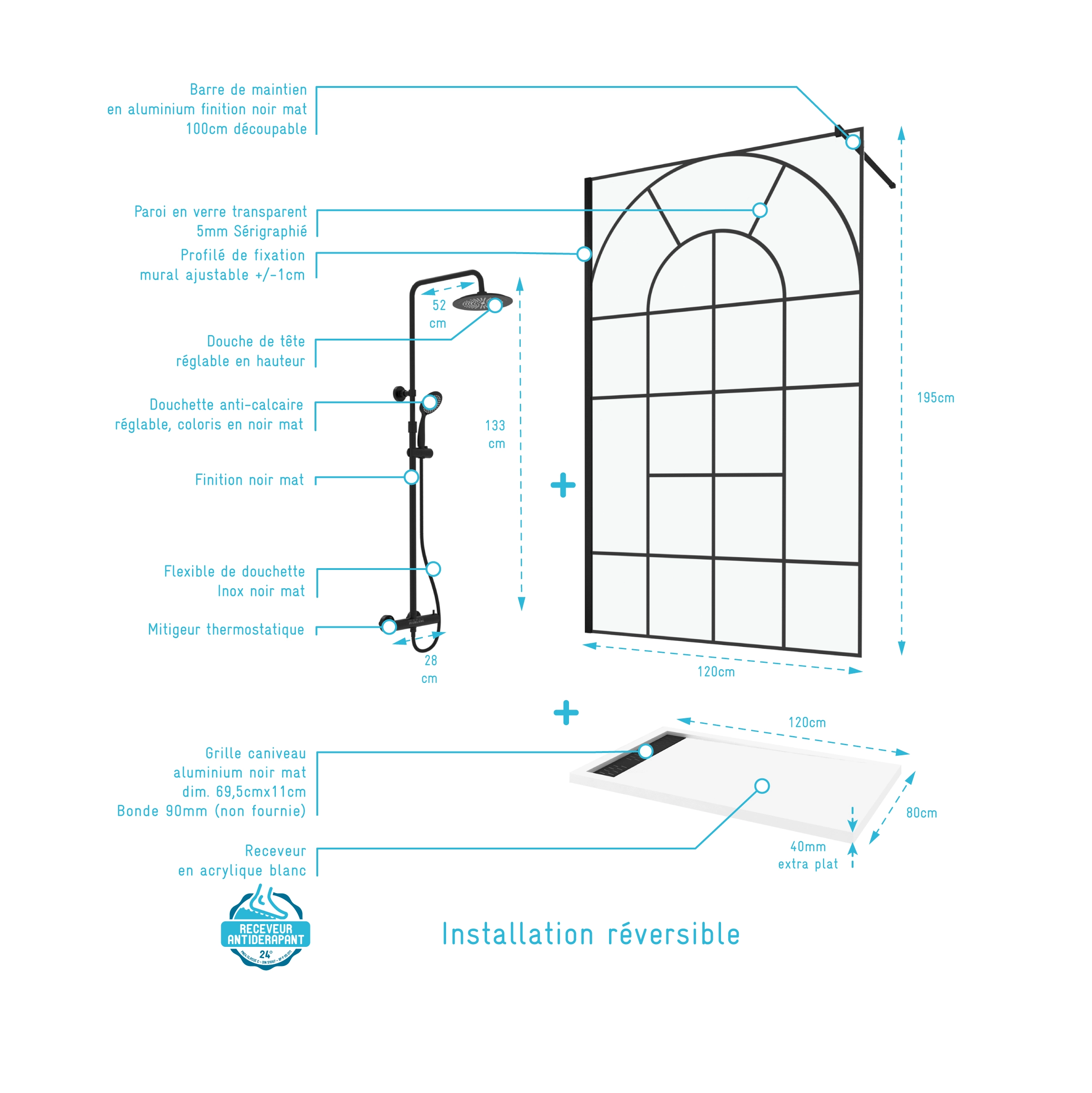 0 avis Paroi de Douche 120x195 Motif Verrière + Receveur 80x120 + Colonne de Douche Noire Thermostatique