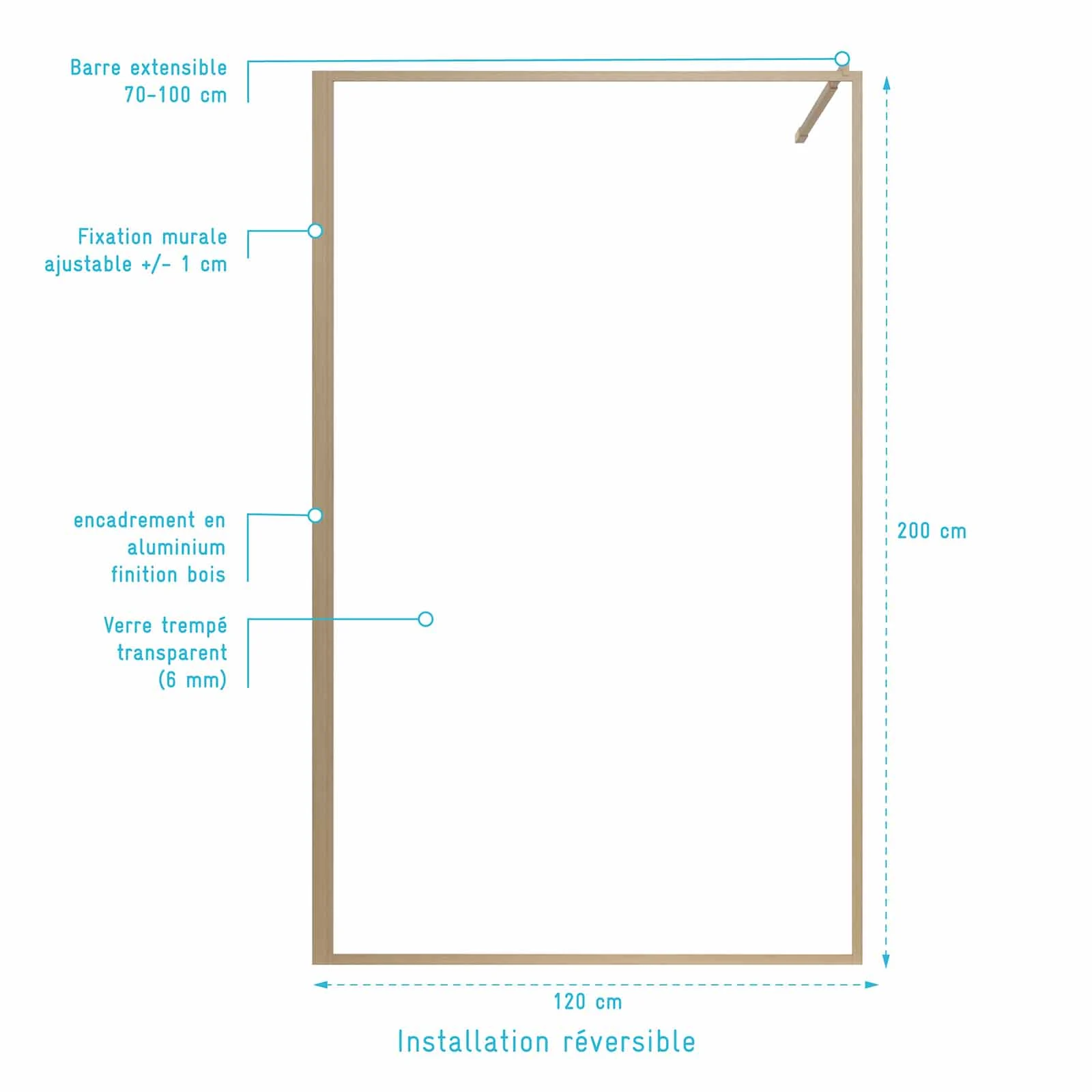 Paroi de Douche 120x200 cm - Cadre et Bras Aluminium Décor Bois - WOODEN CONTOURING