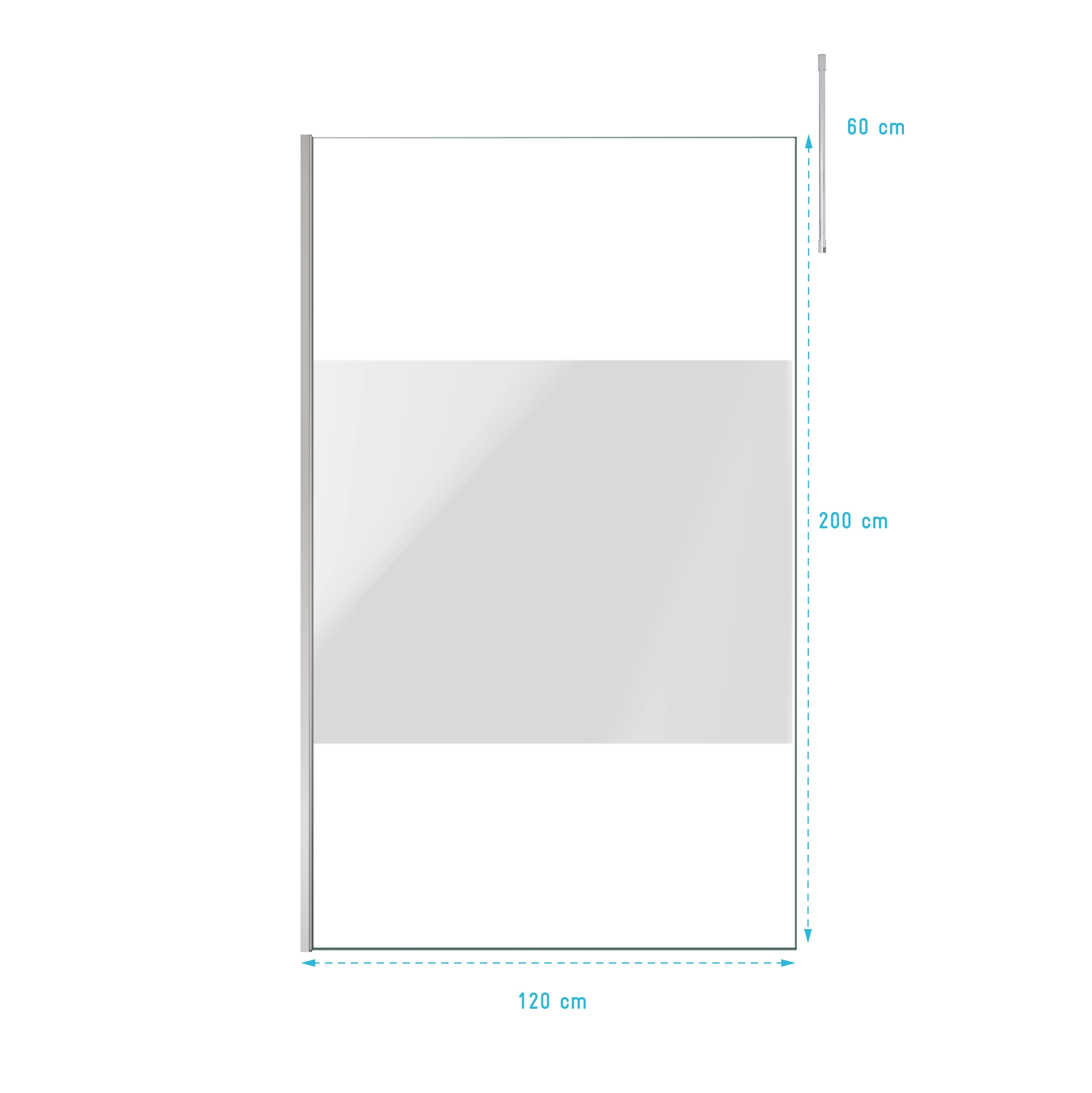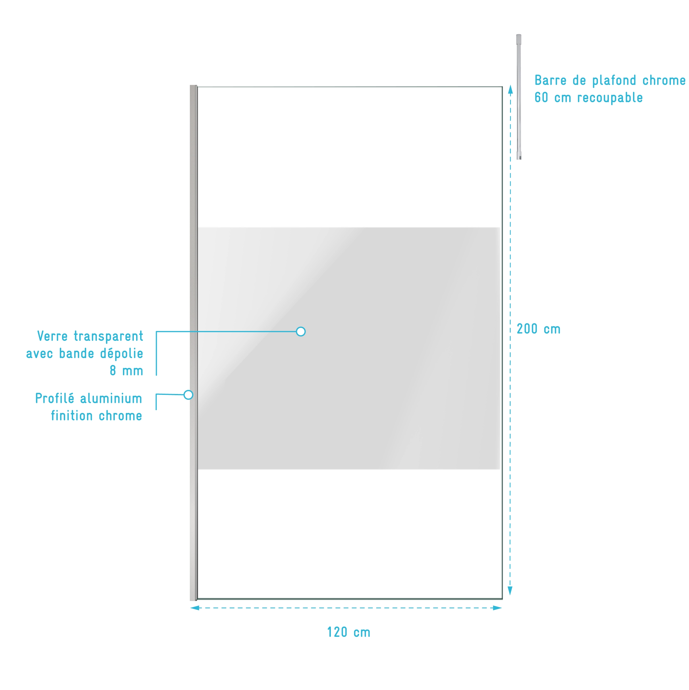 Paroi de Douche 120x200cm Dépolie – Profilé + Barre Plafond Finition Chrome – FREEDOM 2 FROSTED