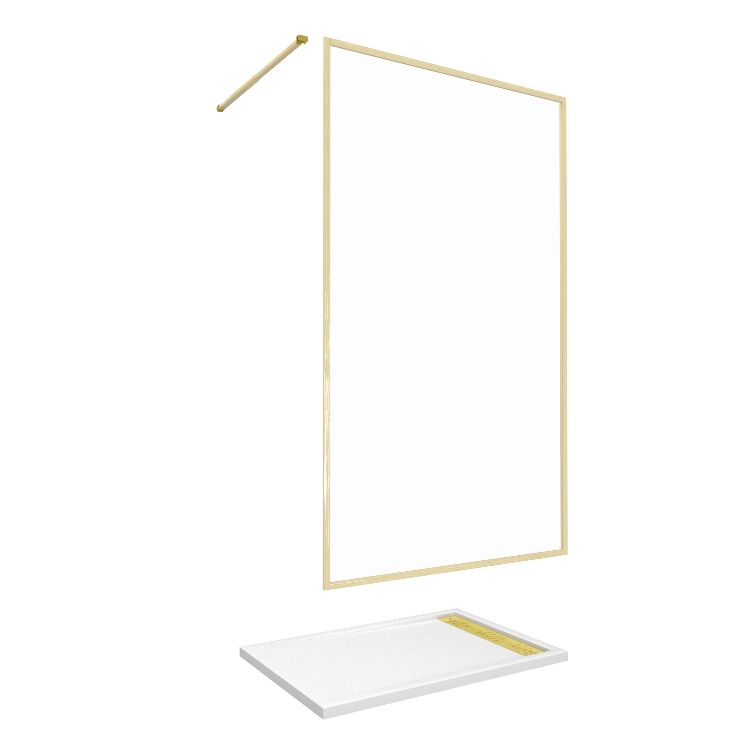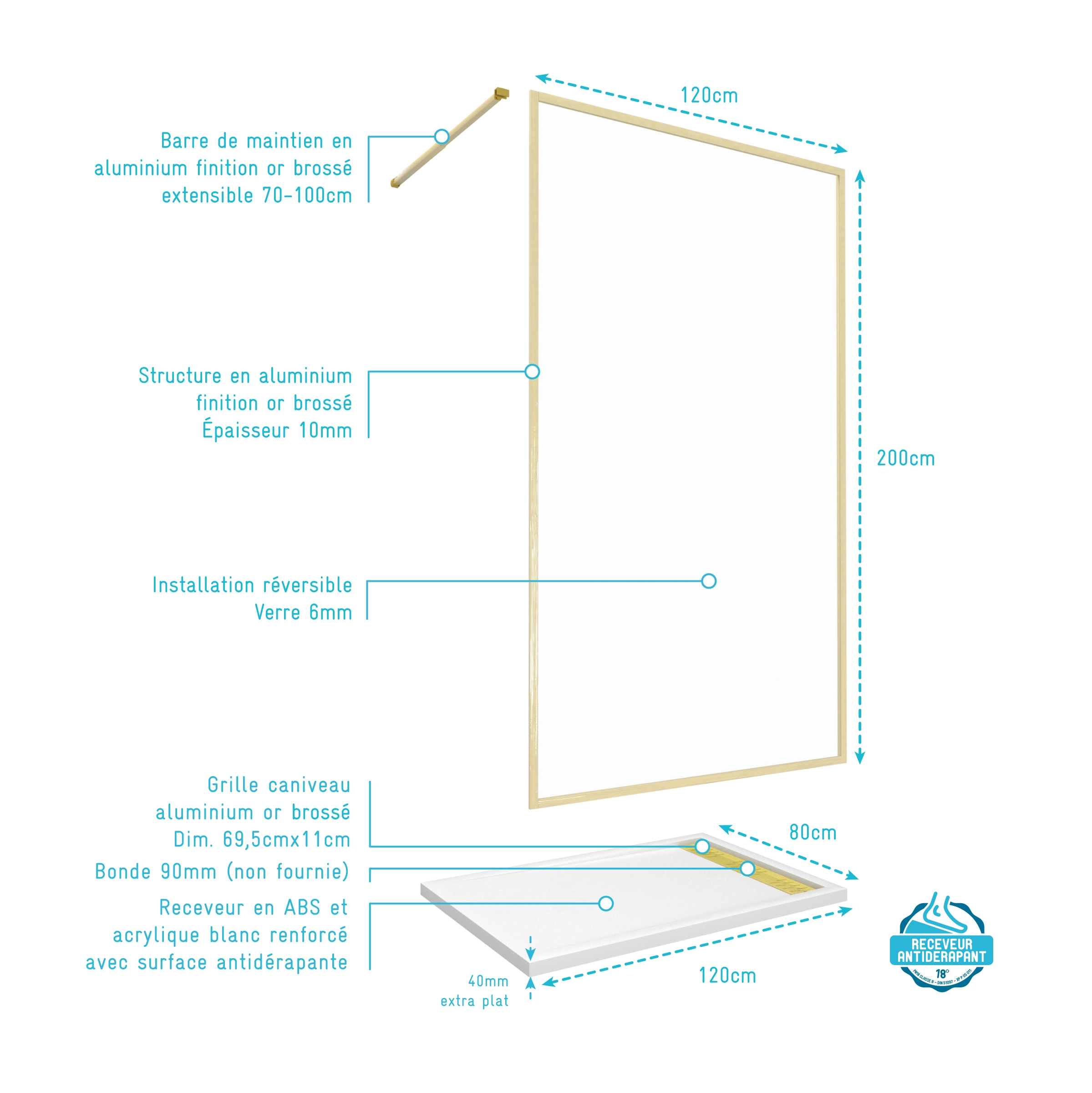 Paroi de Douche 120x200cm + Grille Finition Or Doré Brossé + Receveur Blanc 120x80x4cm