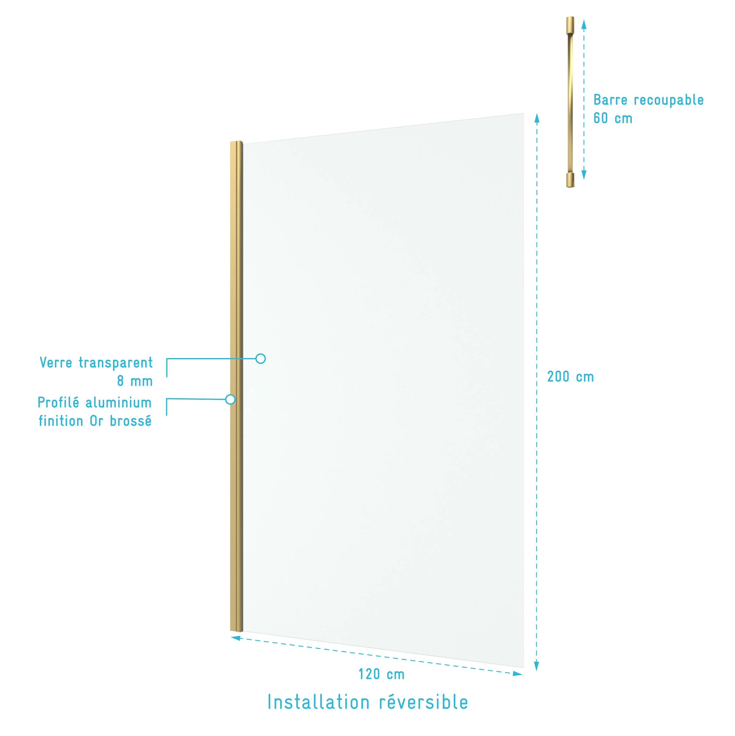 1 avis pour Paroi de Douche 120x200cm Verre 8mm – Profilé + Barre Plafond Finition Or Brossé – FREEDOM 2 GOLD