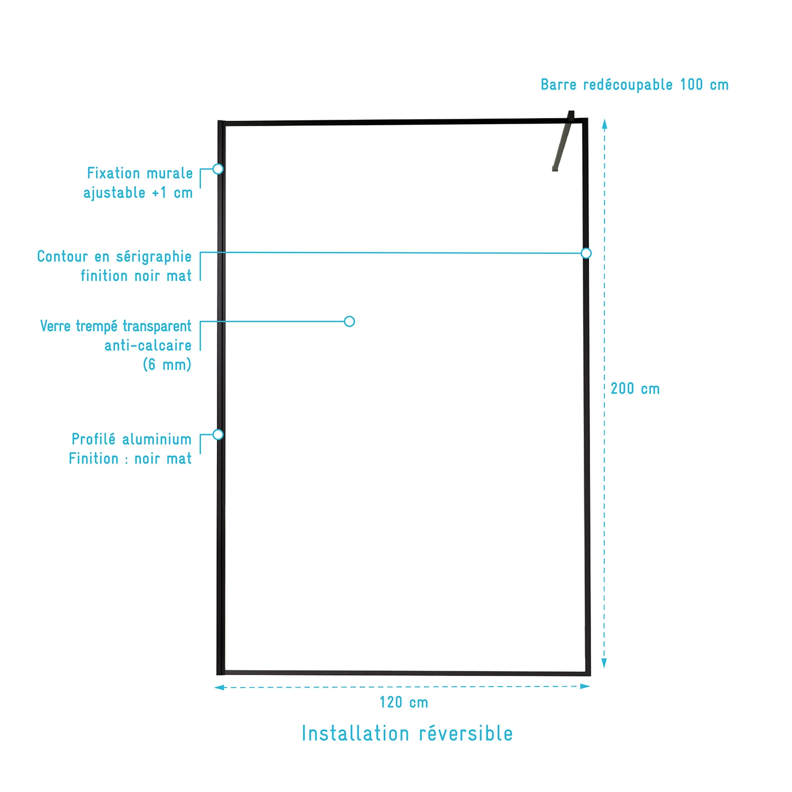 Paroi de Douche 120x200cm – Verre trempé 6mm – Encadrement Ultra-fin Sérigraphié – Finition Noir