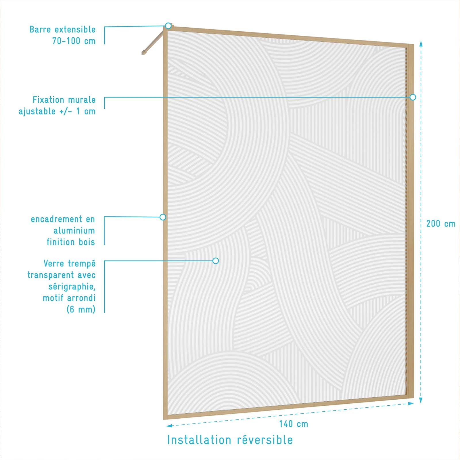 Le verre trempé de 6 mm, orné d’une sérigraphie inspirée des esthétiques japonaises et scandinaves, transforme chaque douche en une expérience visuelle unique. Les lignes arrondies qui se croisent sur la paroi de douche HINATA rappellent les jardins zen et ajoutent une dimension artistique à votre espace. Avec une barre de maintien extensible en aluminium finition décor bois, cette paroi de douche combine sécurité et beauté, pour une salle de bain à la fois pratique et élégante.